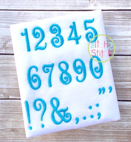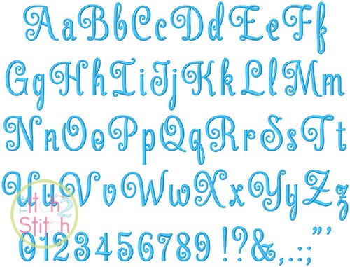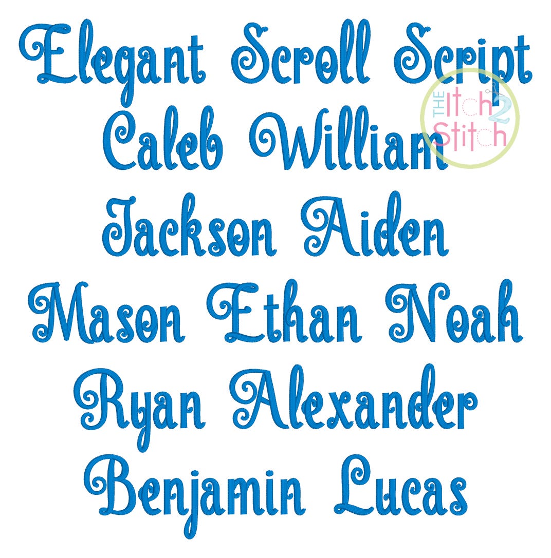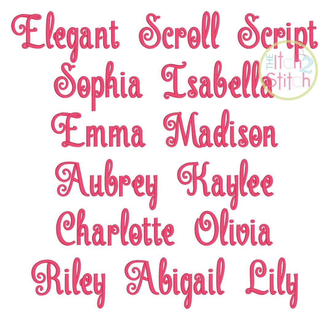 You will receive all Aa-Zz letters, numbers and partial punctuation (71 files) in five sizes. Please note that due to scale some letters from the 3" size do not fit in a 4x4 hoop. Our Elegant Scroll Script font was made to match our Elegant Scroll Monogram, sold separately.