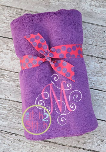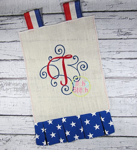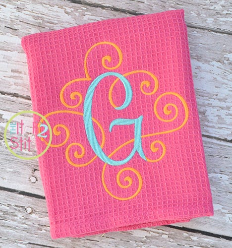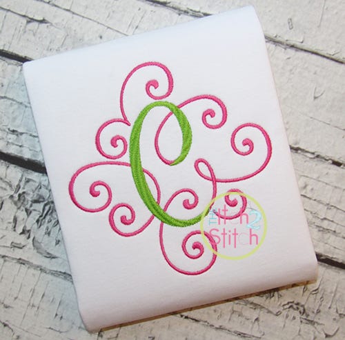 This monogram features a decorative fill stitch pattern for the letter with satin stitch scrolls. Please note that as designed these sizes do not fit in a 5x7 hoop. However, you may be able to stitch the 6" size in a 5x7 hoop if you rotate the design 45 degrees in software.