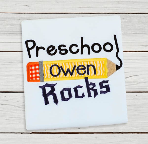 Is your little rockstar going back to school? These designs are perfect for the occasion! The set includes four different designs: Preschool Rocks, First Grade Rocks, Second Grade Rocks, and Third Grade Rocks. The pencil is applique, the text is satin stitch.