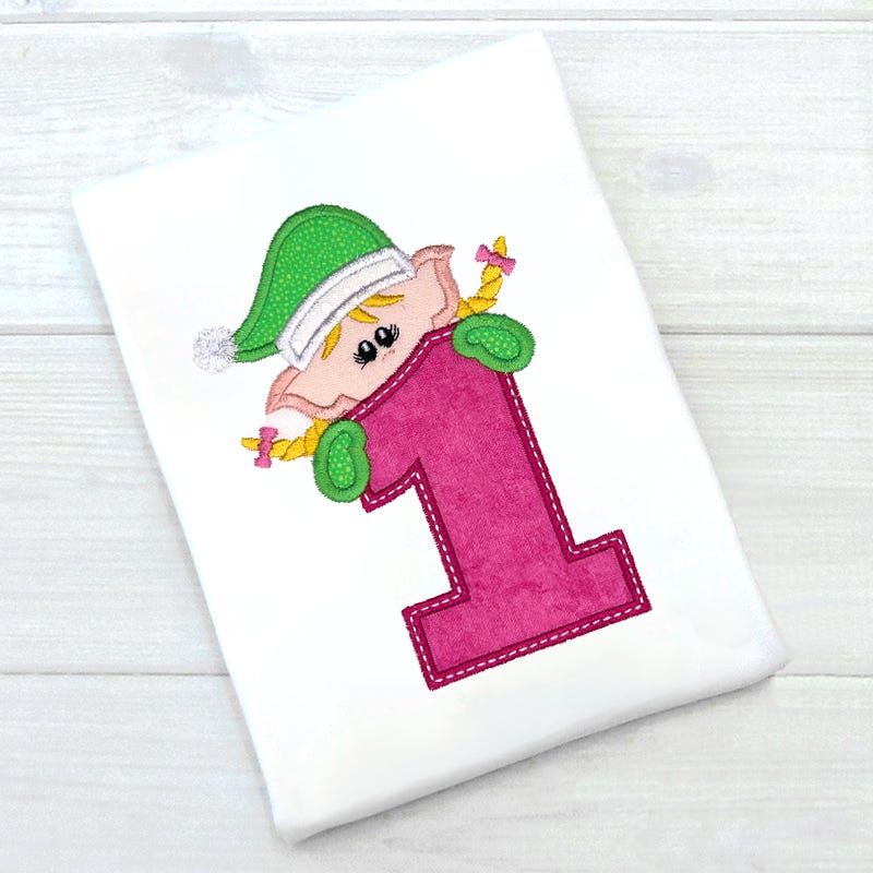 This design features and Elf Girl peeking over an applique number 1. No other text is included in the design file.