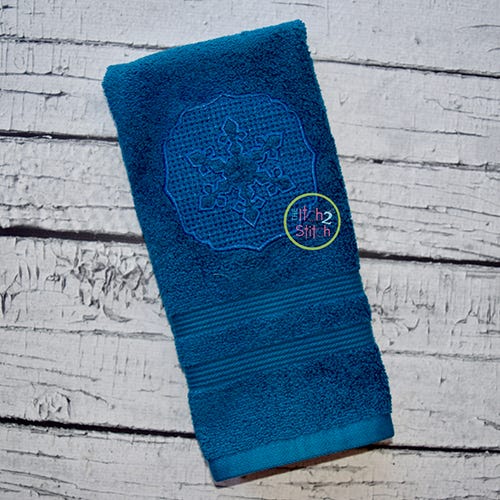To recreate the look of our primary sample image we recommend using tearaway stabilizer on the back of the towel and a thin water soluble stabilizer (like Sulky Solvy) on the top of the towel. We used one thread that coordinated with the color of the towel for all three steps of the design for a tone-on-tone look