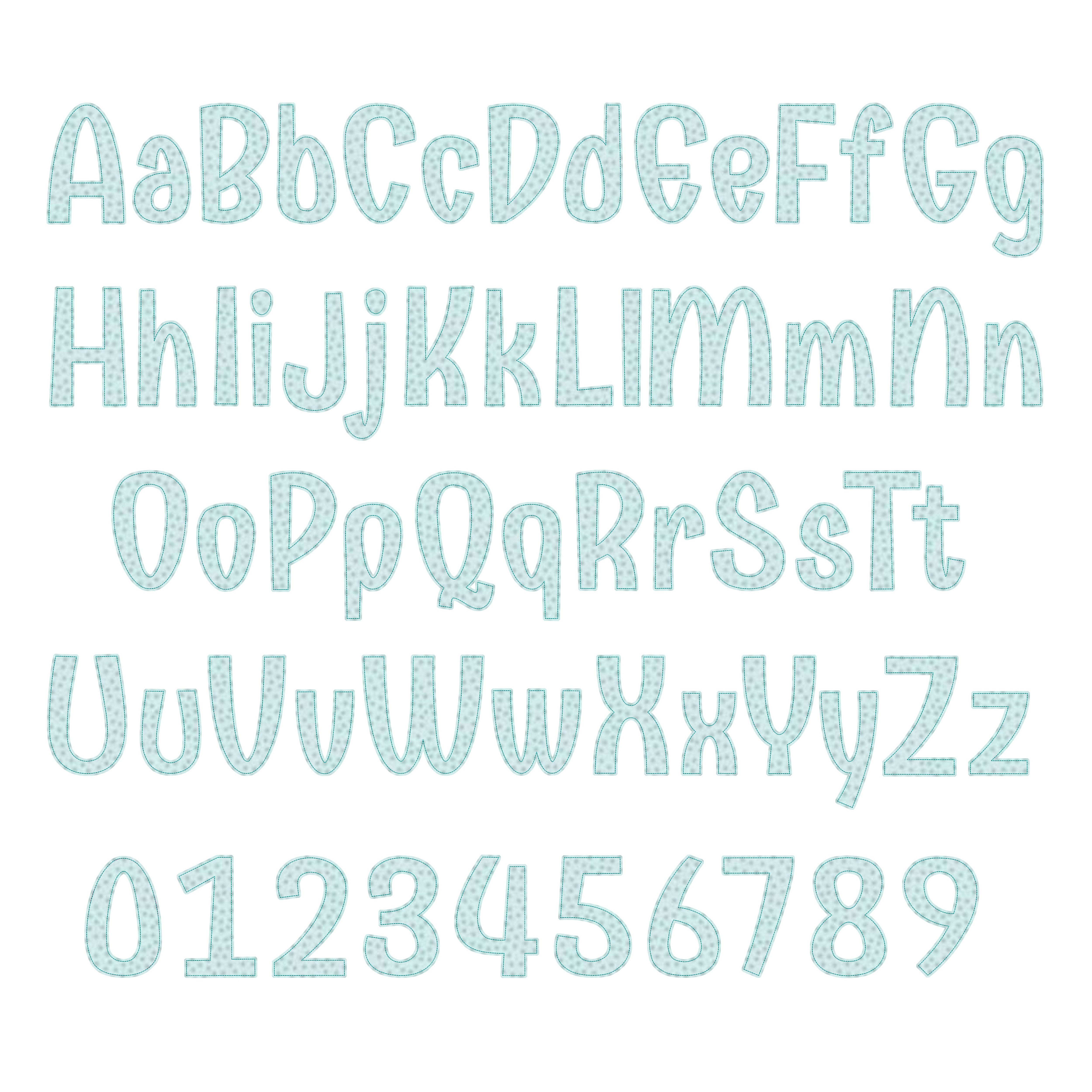 Introducing a fun new font with infinite possibilities! Emmy Doodle Bean Stitch Applique Alphabet includes capital and lowercase letters along with numbers in 9 sizes (2.5-inch, 3-inch, 3.5-inch, 4-inch, 4.5-inch, 5-inch, 5.5-inch, 6-inch, and 6.5-inch).