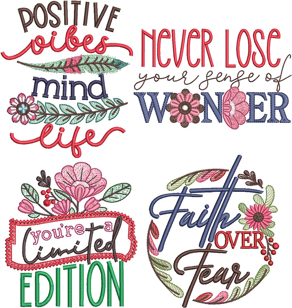 Stitch out a sweet message of encouragement for someone you love! Our Encouraging Words Set 1 has four encouraging quotes, each embellished with lovely floral accents.