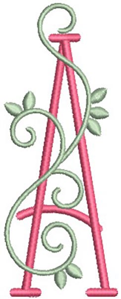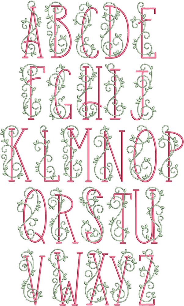 Our Esmerelda Alphabet features satin stitch lettering with a satin stitch vine.