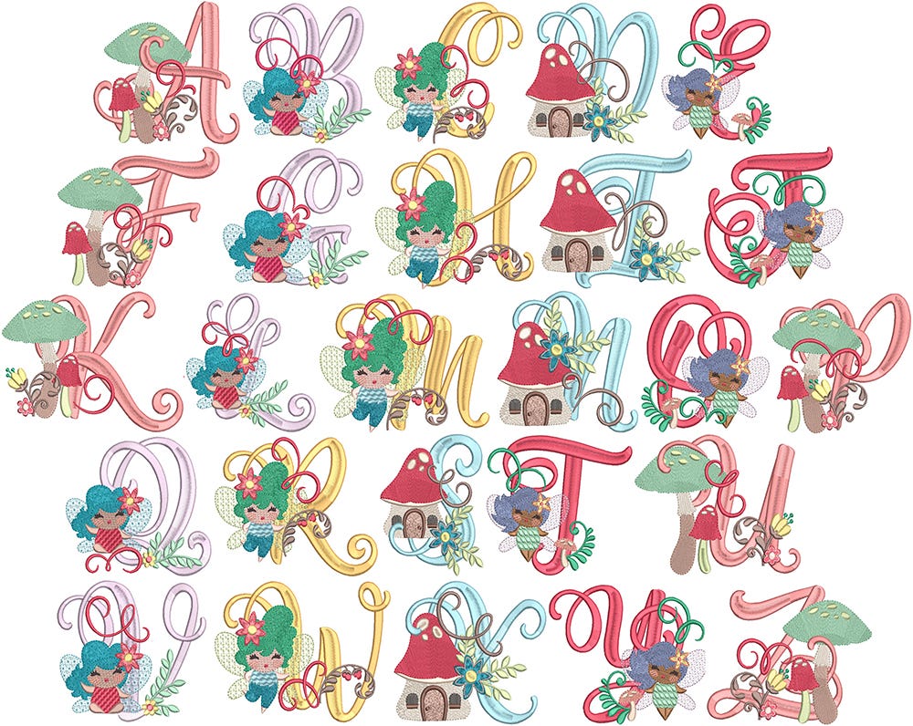 Our Fairy Alphabet features split-satin stitch lettering with embroidered fairy-themed icons. There is one file per letter, as pictured.