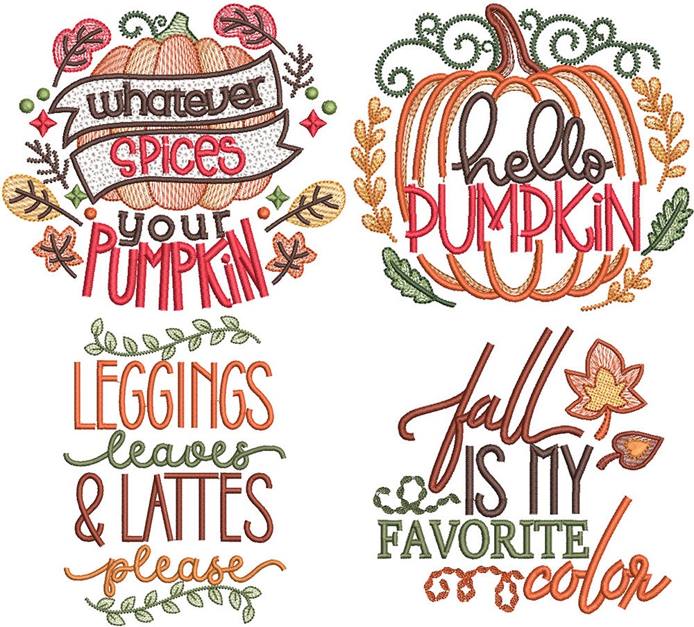 4 fun fall themed word art designs featuring satin stitch lettering with a blend of satin, sketch and bean stitch design