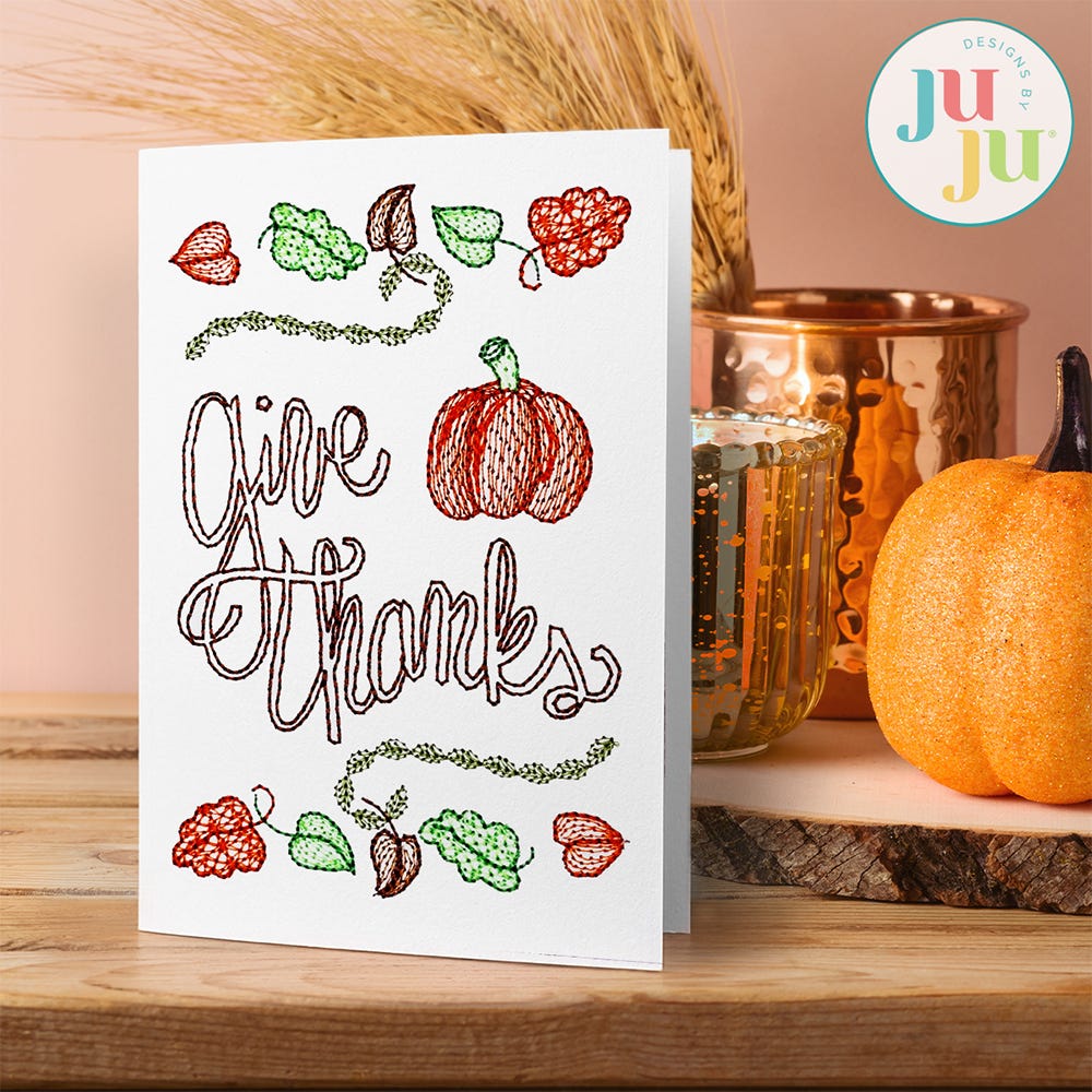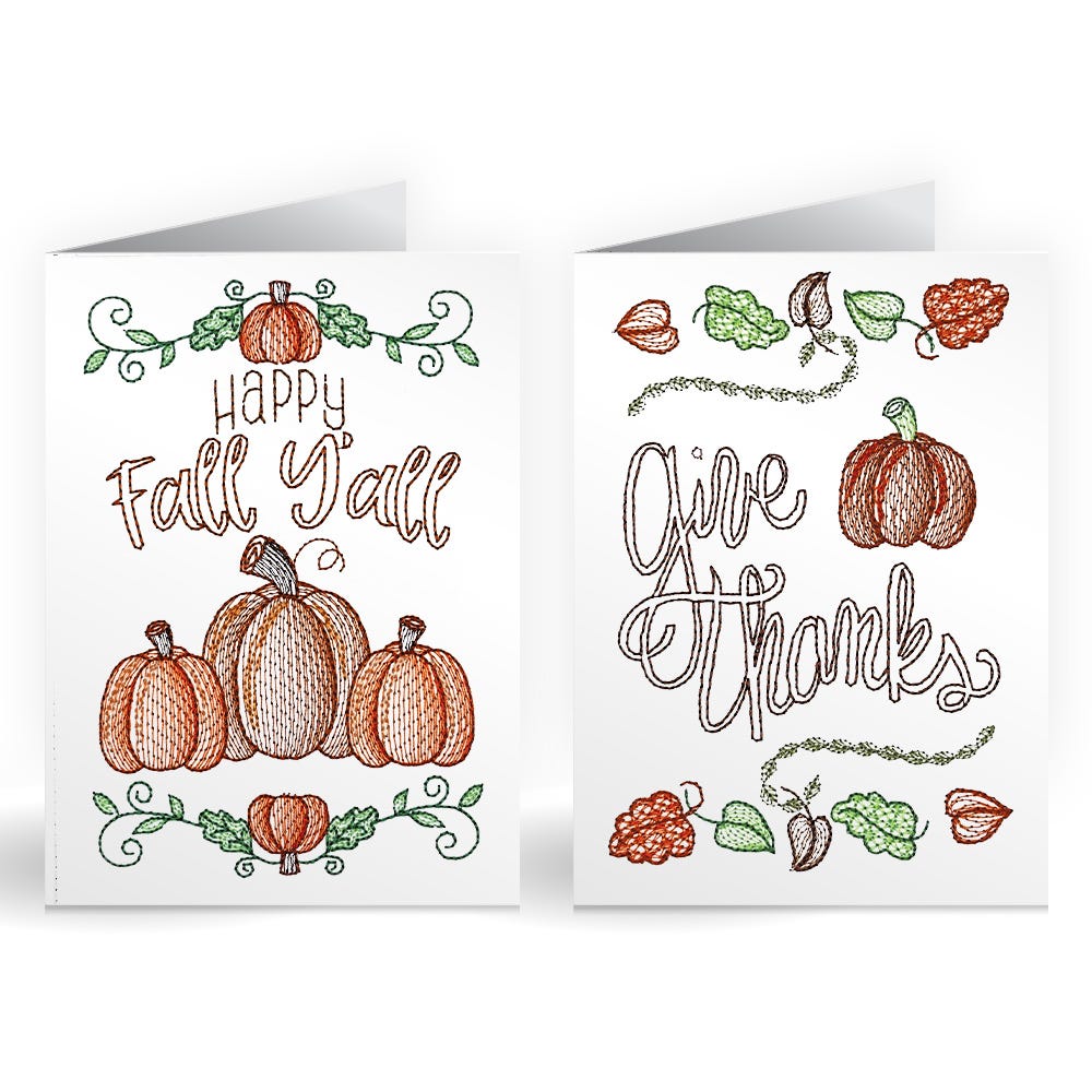 Send autumn cheer with our Fall Greeting Cards embroidery set! This collection includes two festive greeting card sentiments - "Happy Fall Y'all" and "Give Thanks" - perfect for adding a handmade touch to seasonal messages and gifts.