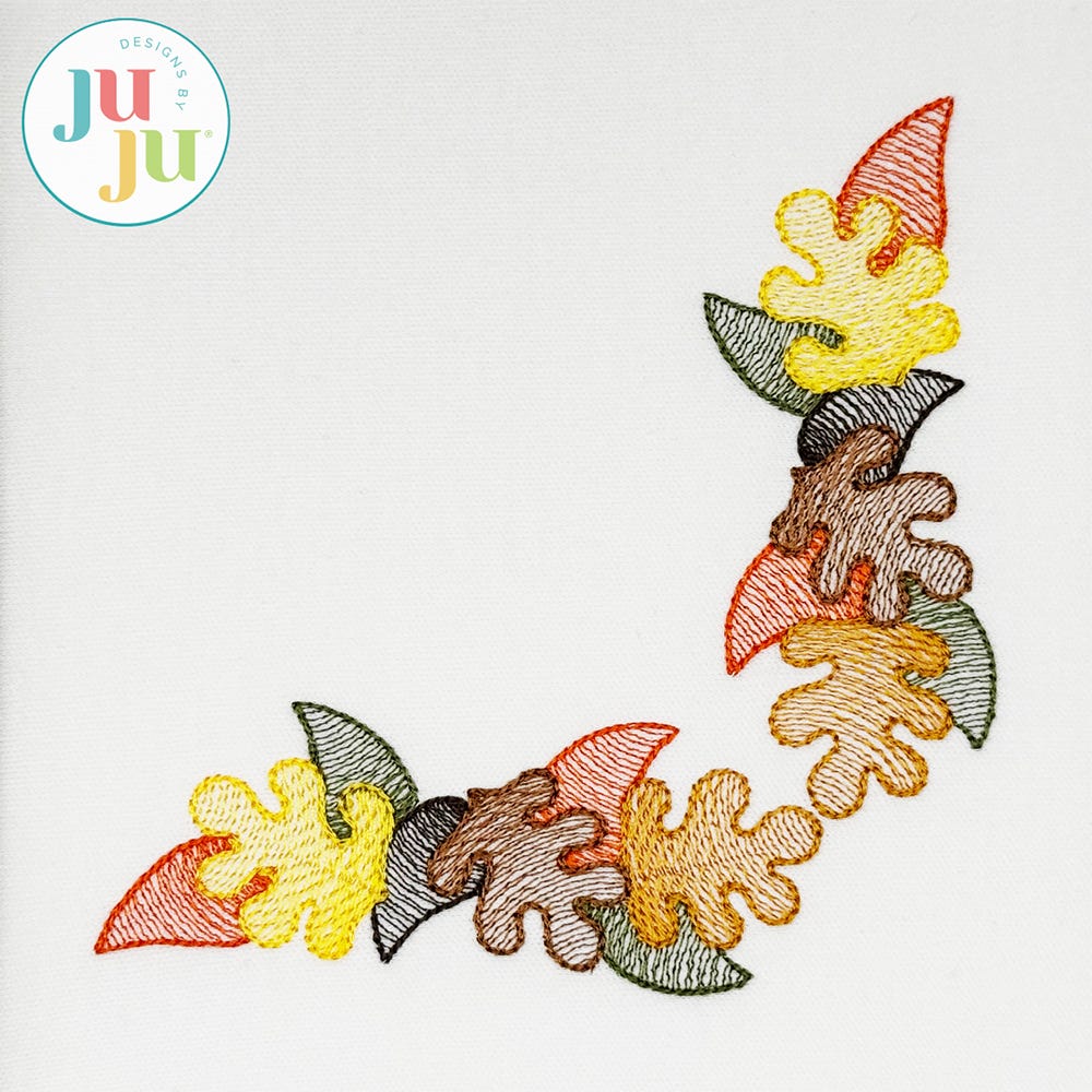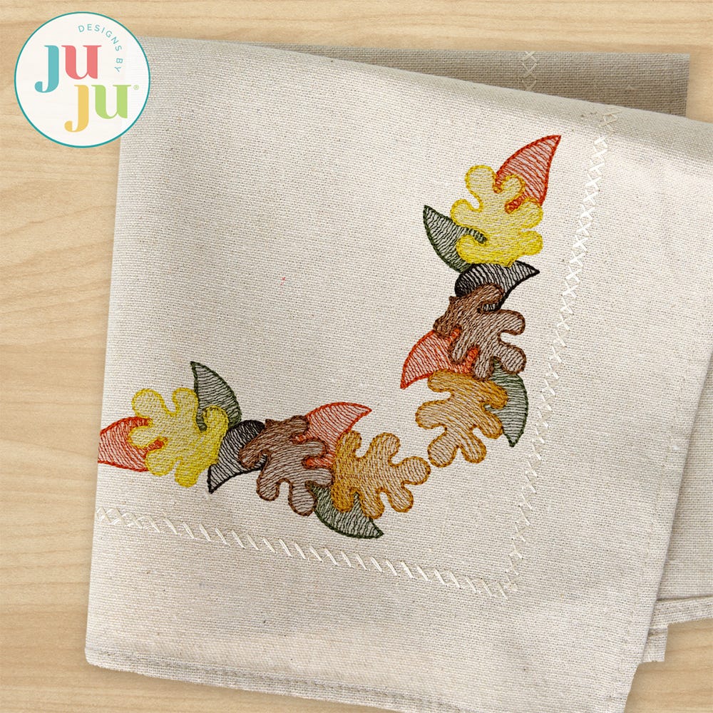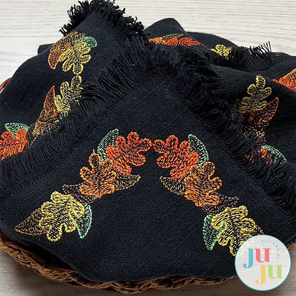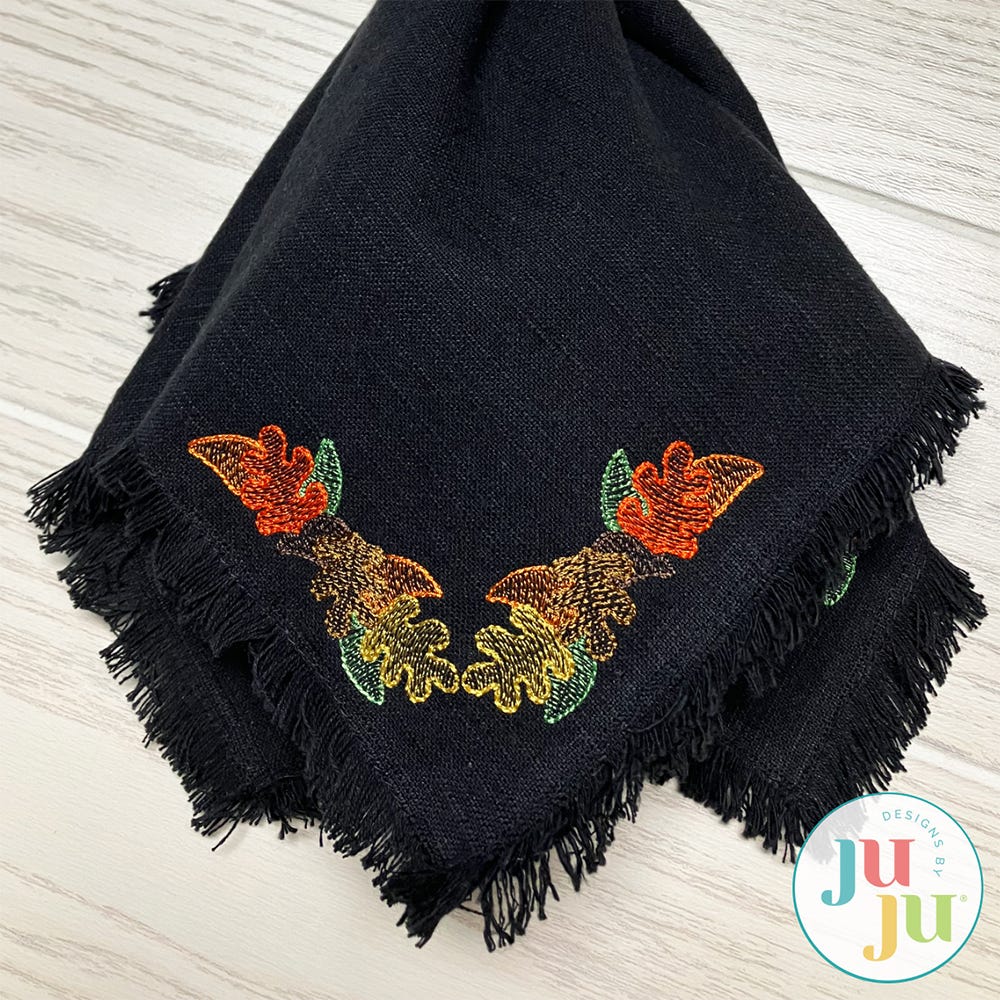 Dress your items with some Fall flair! Our Fall Leaves Corner design is crafted to coordinate with our ITH Jack-o'-Lantern modular items and is perfect for your autumn decorating! The 4x4 size is designed to fit napkin corners.