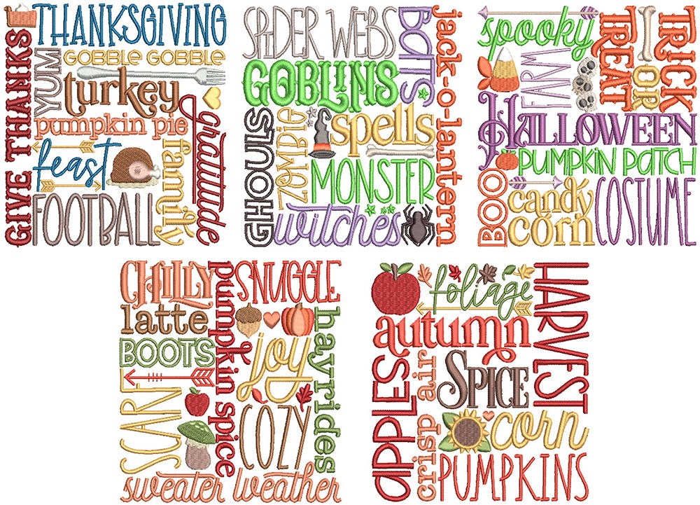 5 fun fall inspired subway art designs! These designs are embroidery-only with satin stitch text and a mix of satin and fill stitch elements.