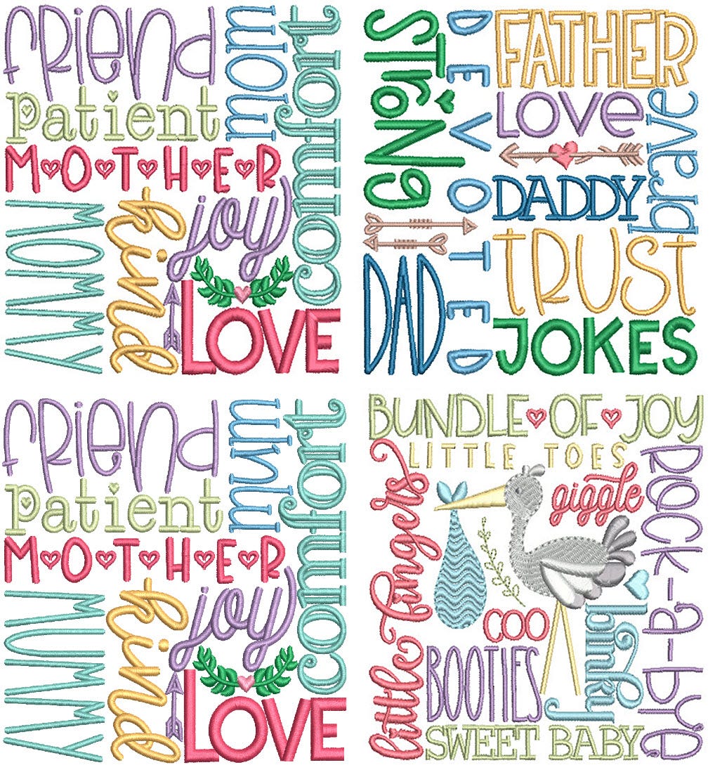 3 sweet family themed subway art designs -- both Mom and Mum versions included! These embroidery-only designs have satin stitch lettering with satin and fill stitch design accents.