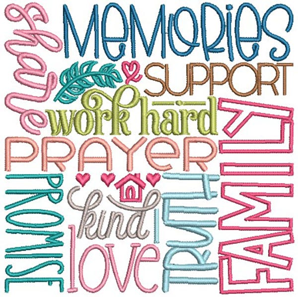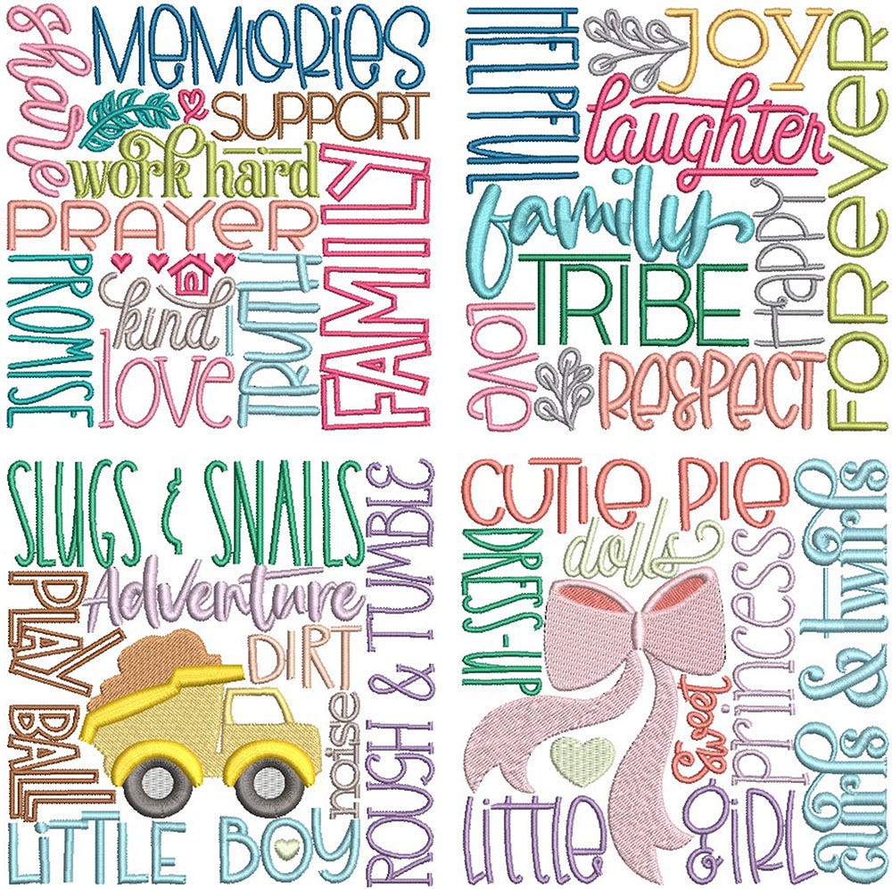 4 super sweet family themed subway art designs! These embroidery-only designs have satin stitch lettering with satin and fill stitch design accents.