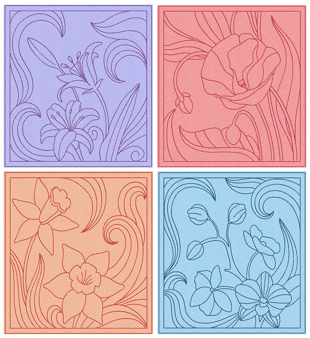 4 more fancy flower quilt blocks! These blocks feature quadruple run (four passes of running stitches) for a nice bean stitch finish.