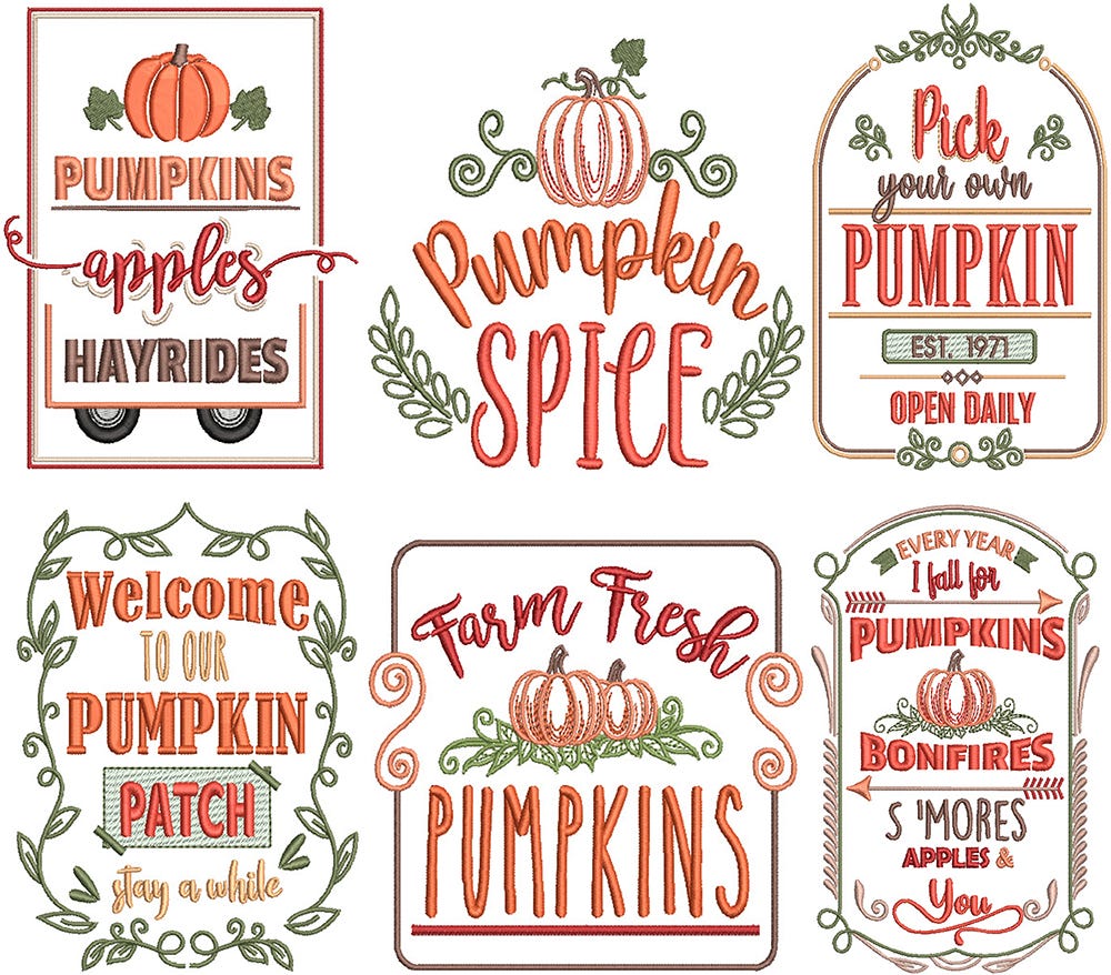 6 more beautiful and festive autumn themed farmhouse designs! These designs are embroidery-only - primarily satinĀ stitch with a few bean stitch and sketch fill details.
