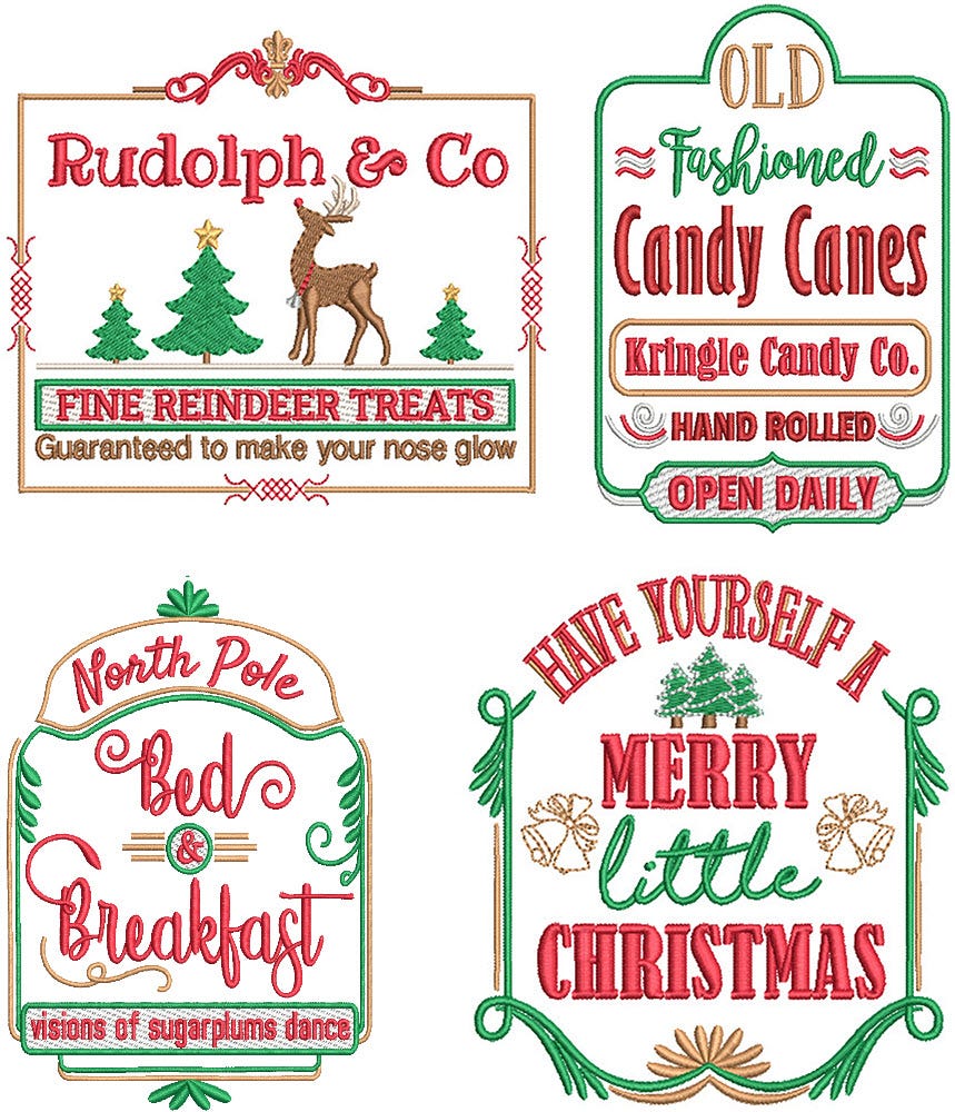 4 more beautiful farmhouse style Christmas designs! These designs are embroidery-only with satin stitch lettering and a mix of satin, bean and fill stitch design elements.