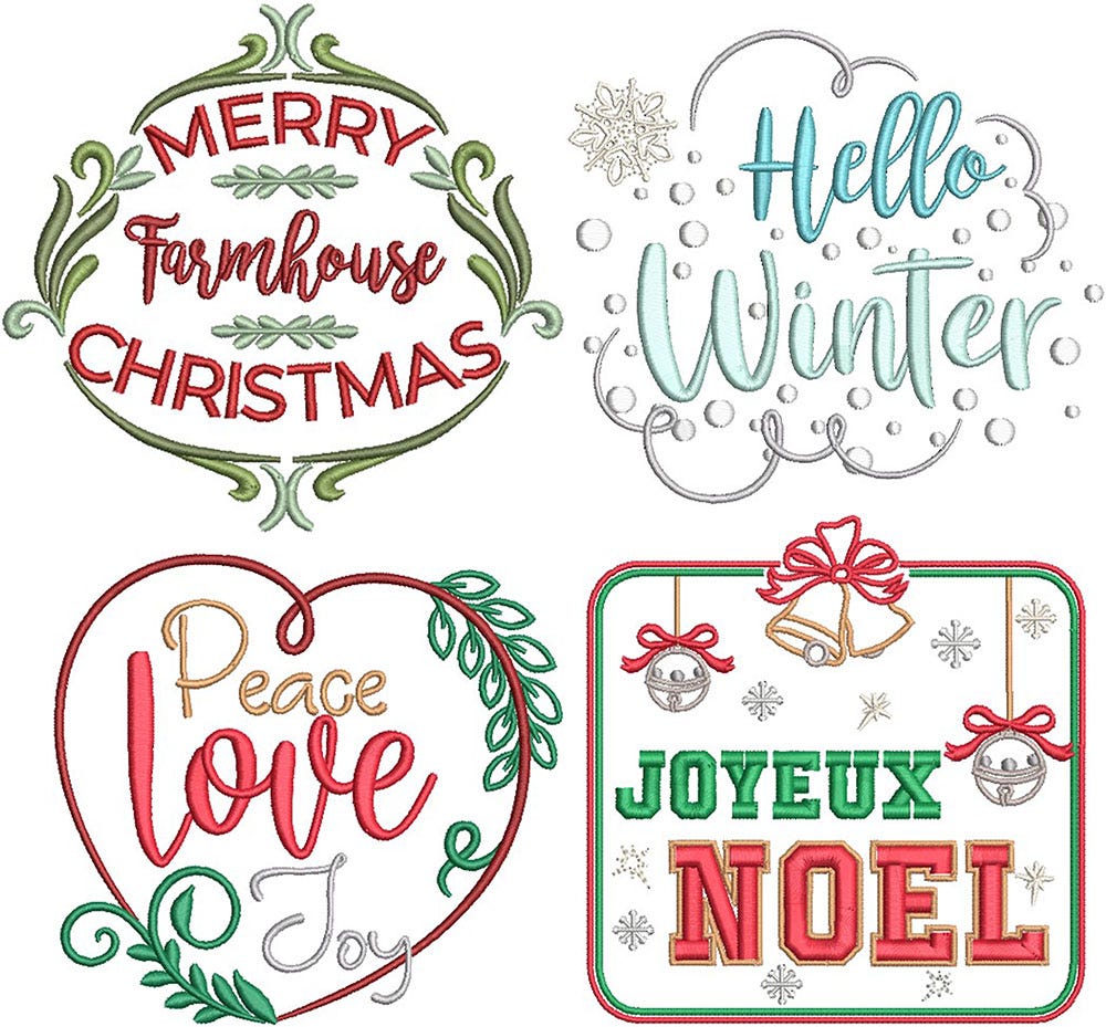 4 more beautiful farmhouse style Christmas designs! These designs are embroidery-only with satin stitch lettering and design elements.