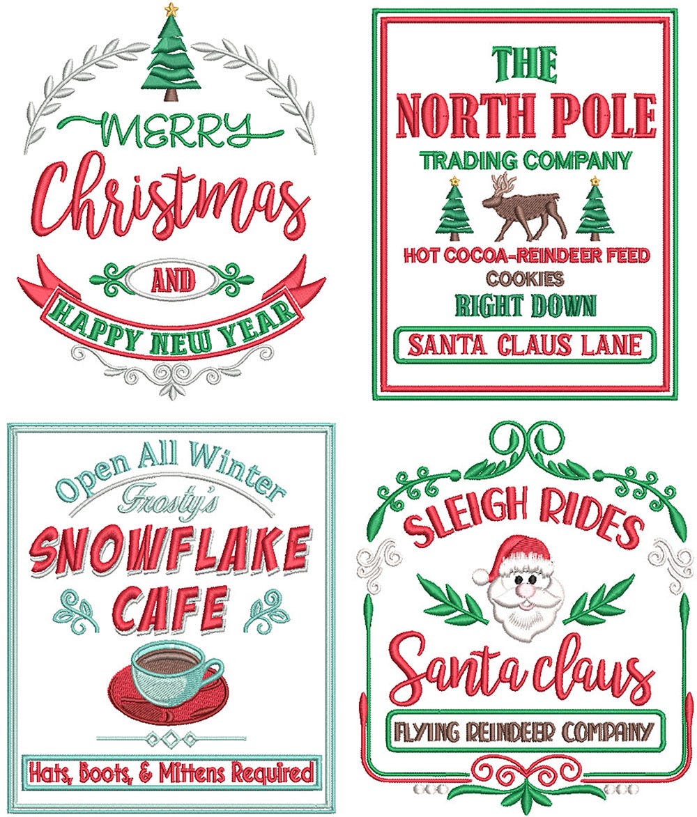 4 more beautiful farmhouse style Christmas designs! These designs are embroidery-only with satin stitch lettering with satin and fill stitch design elements.