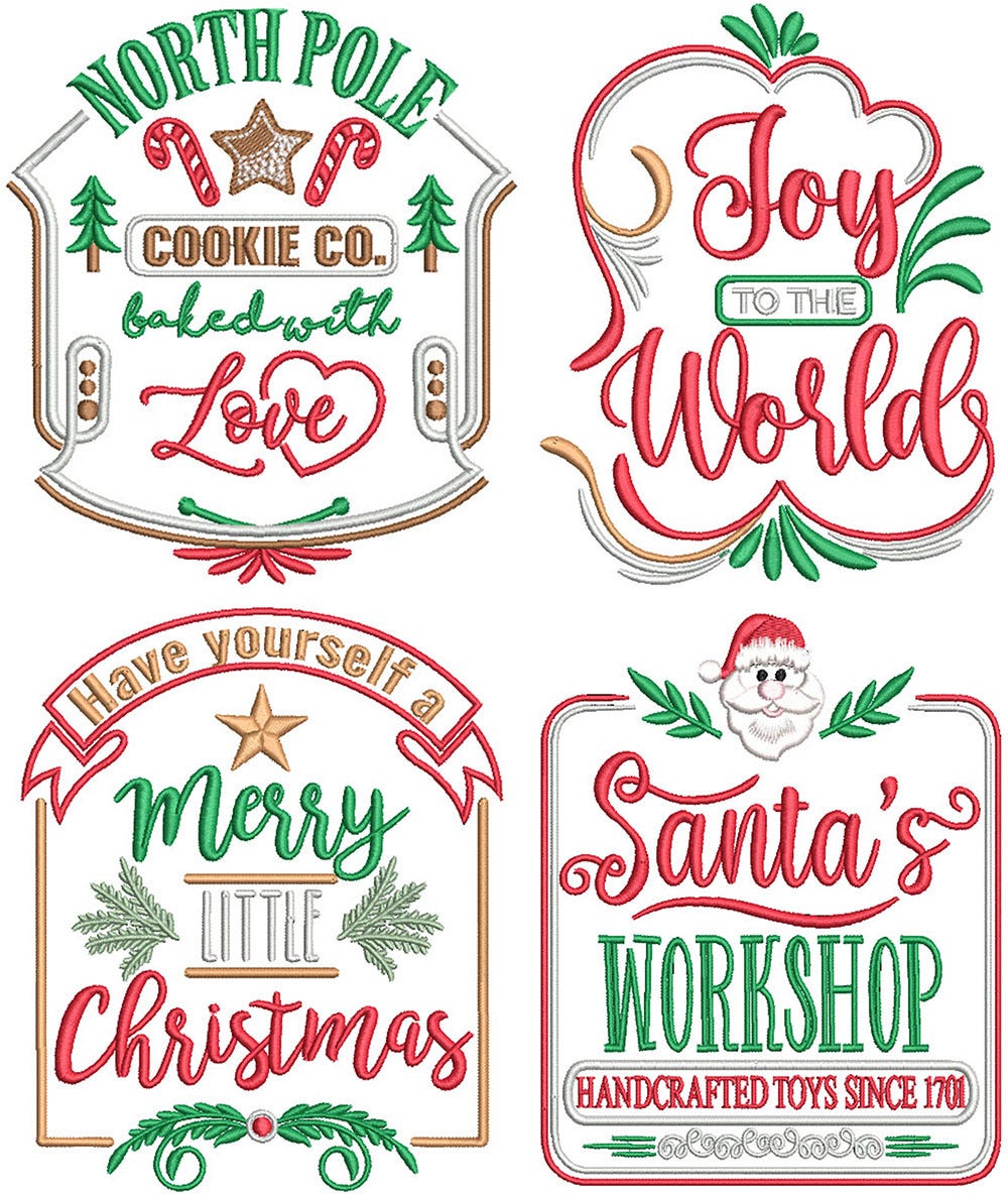 4 more beautiful farmhouse style Christmas designs! These designs are embroidery-only with satin stitch lettering with satin and fill stitch design elements.