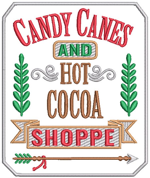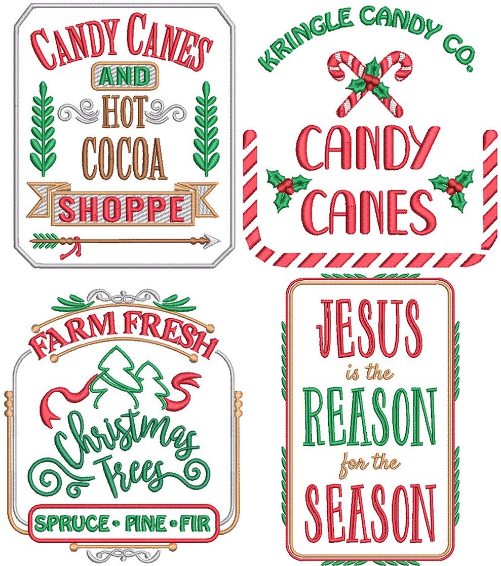 4 more beautiful farmhouse style Christmas designs! These designs are embroidery-only with satin stitch lettering and design elements. The "Candy Canes and Hot Cocoa Shoppe" design features sketch fill banners.