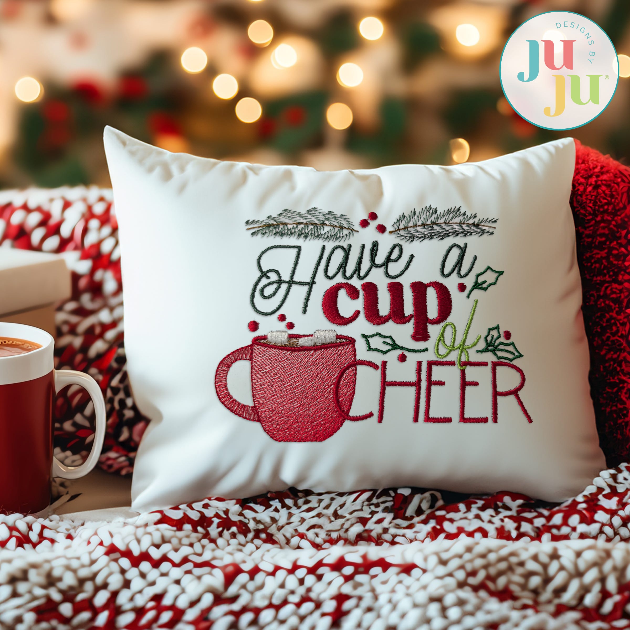 Four more beautiful farmhouse style Christmas designs! These feature satin stitch text with a blend of satin, sketch, and fill stitch design details. This set includes: "I'll be Home for Christmas," "Have a cup of cheer," "all is calm, all is bright," and "let it snow."