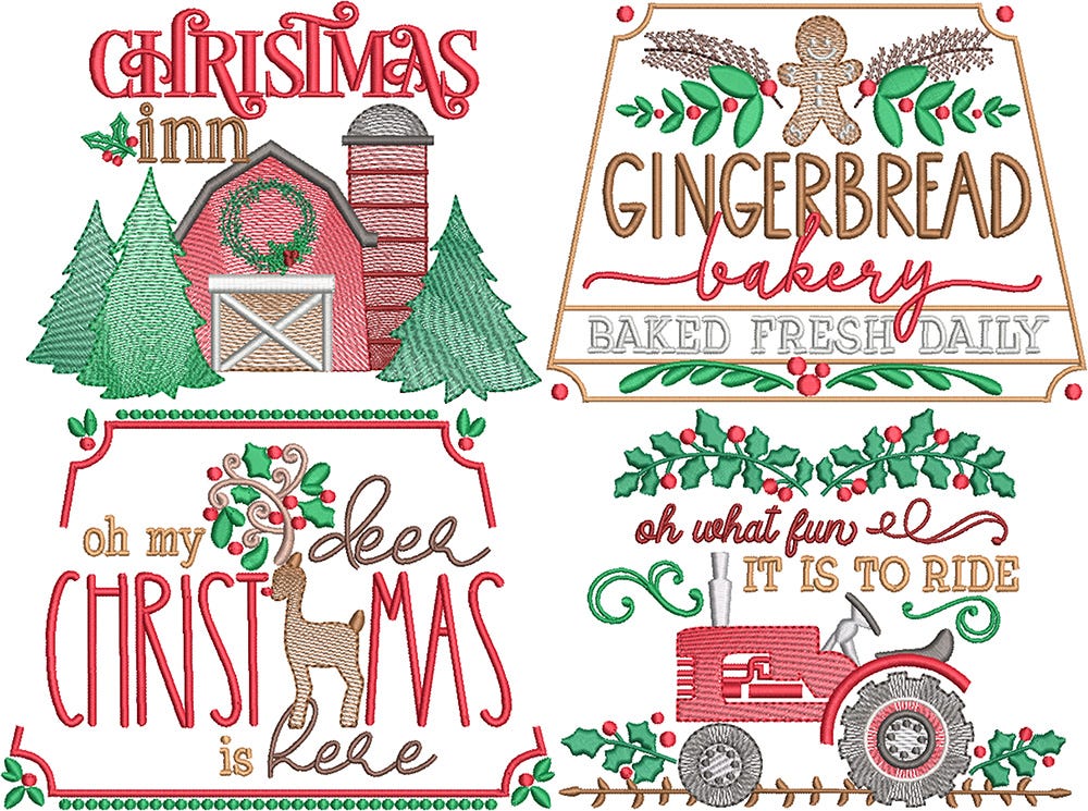 Four more beautiful farmhouse style Christmas designs! These feature satin stitch text with a blend of satin stitch and sketch fill design details. This set includes: "Christmas Inn," "Gingerbread bakery," "oh my deer Christmas is here," and "oh what fun it is to ride."