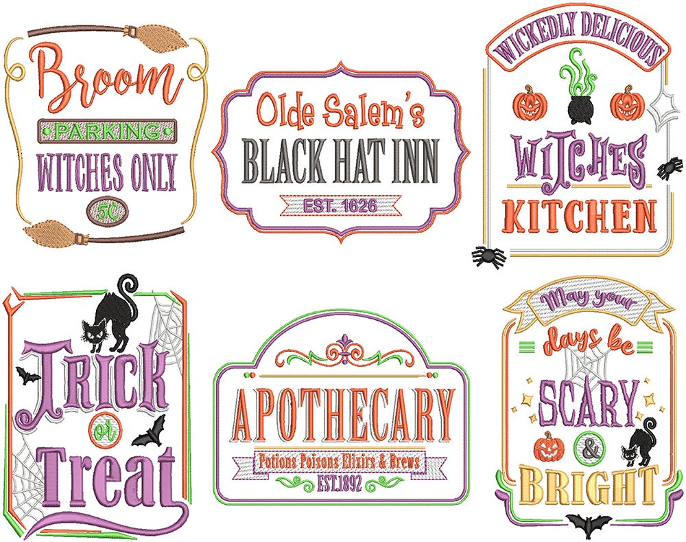 6 more spooky and sweet Halloween inspired farmhouse designs! These designs are embroidery-only, primarily with satin stitch lettering and design elements. Please note the banners feature a light and airy sketch fill pattern.
