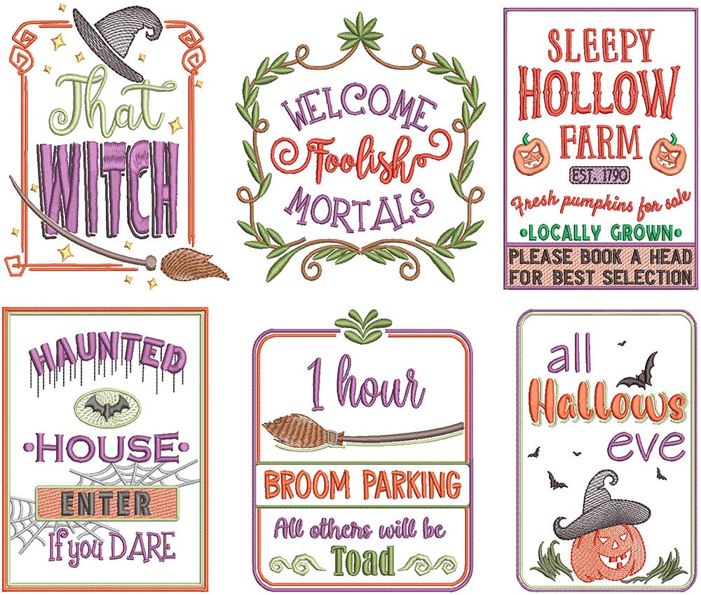 6 more scary cute Halloween designs! These designs are embroidery-only with satin stitch lettering and a mix of satin, sketch, fill and bean stitch design elements.