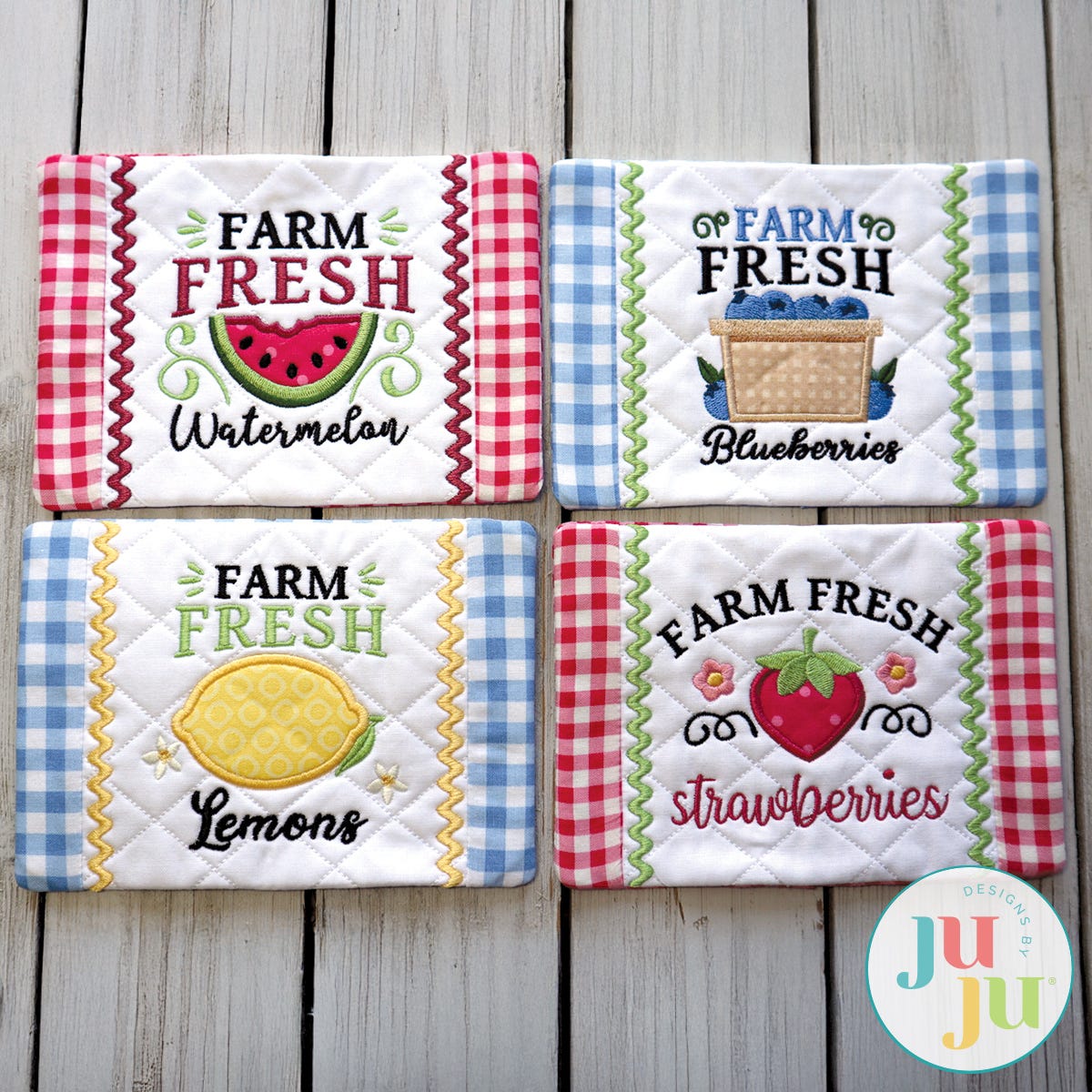 Formats included: DST, EXP, HUS, JEF, PES, VIP, VP3, XXX. Please note ART, PCS and SEW are not available.Mug rugs finished size: 6.75” w x 4.75” h
