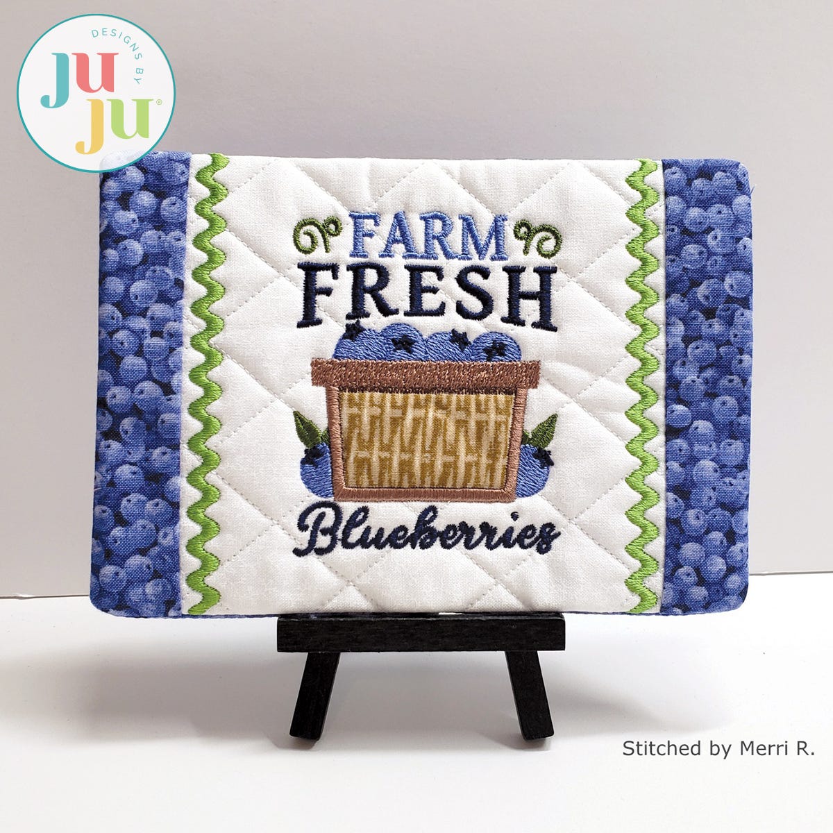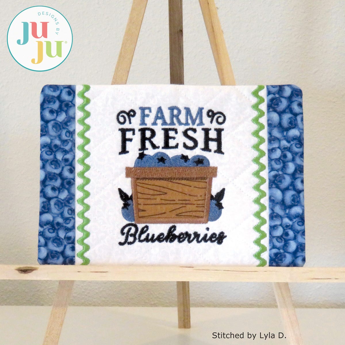 This Blueberry-themed mug rug stitches up quickly. The mug rug has an applique element and the background of the mug rug is quilted. The ricrac borders are part of the embroidery. This mug rug is completely finished in the hoop; no additional sewing machine or hand stitching required.