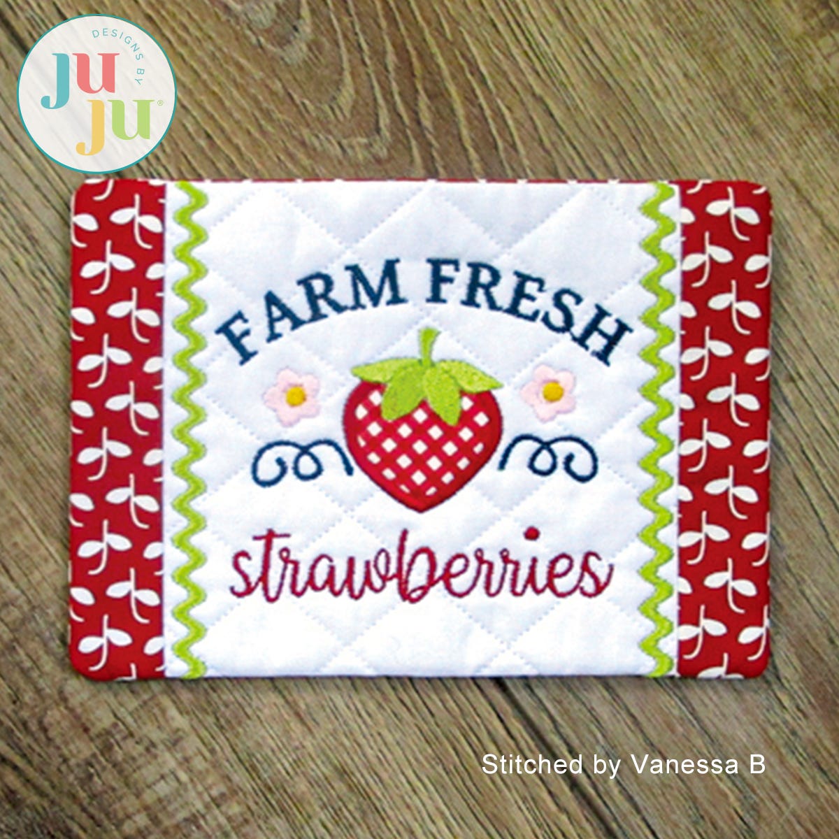 This Strawberry-themed mug rug stitches up quickly. The mug rug has an applique element and the background of the mug rug is quilted. The ricrac borders are part of the embroidery. This mug rug is completely finished in the hoop; no additional sewing machine or hand stitching required.