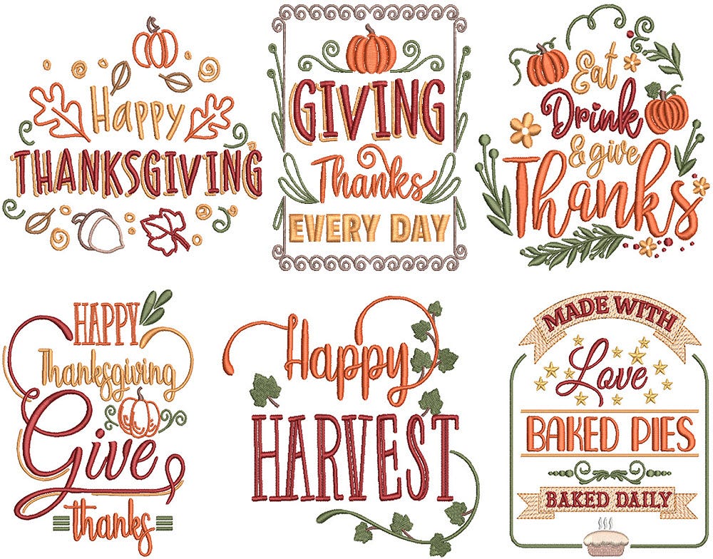 6 more lovely Thanksgiving inspired farmhouse signs! These designs are embroidery-only with satin stitch lettering and a mix of satin and fill stitch design elements. Please note the banners feature a light and airy sketch fill pattern behind the text.
