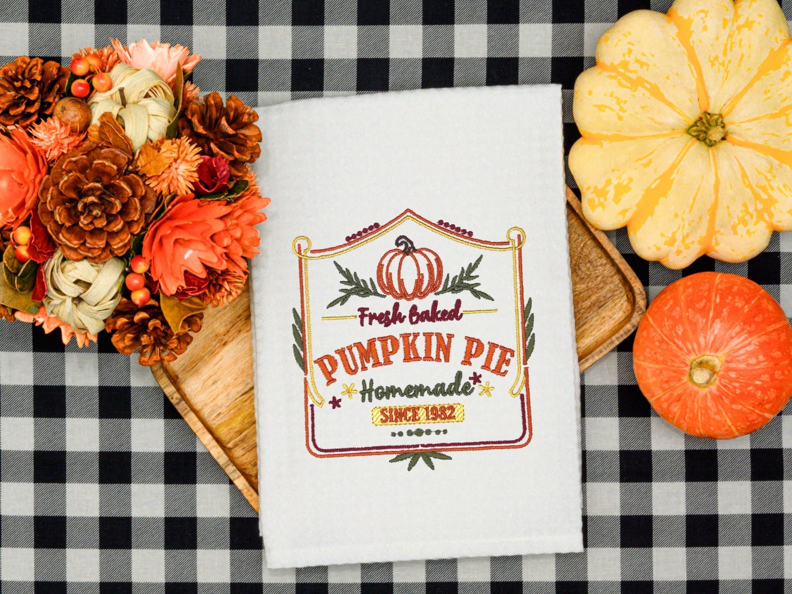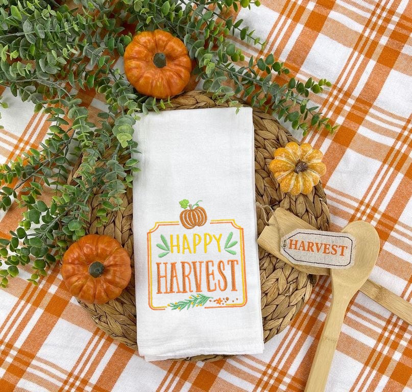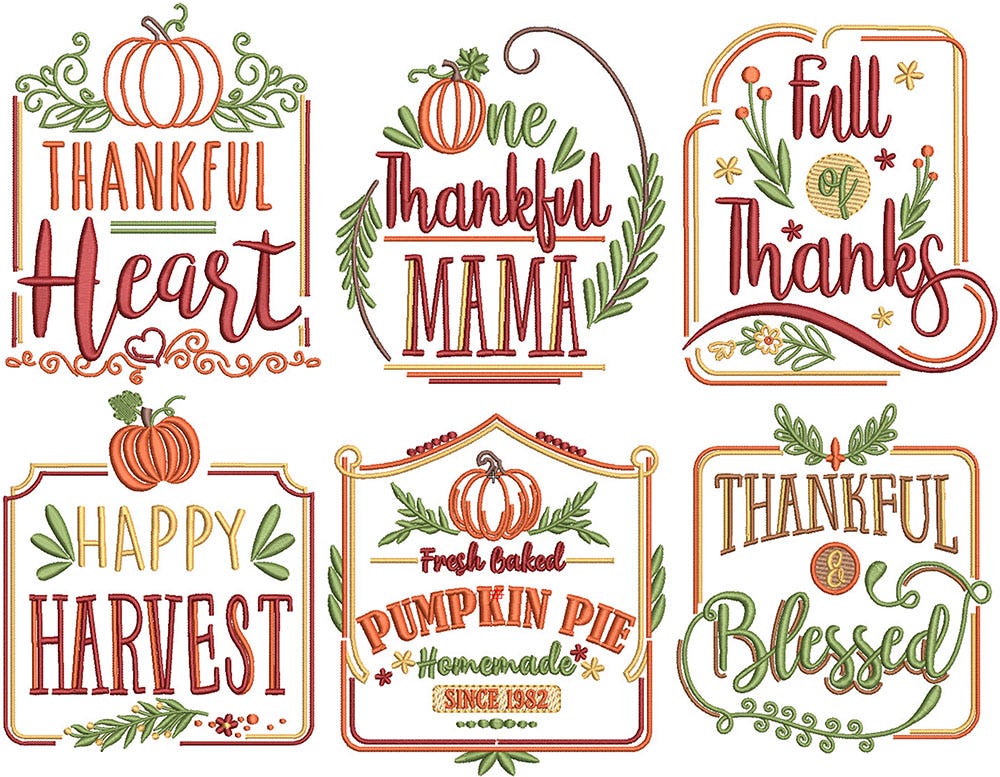 6 more lovely Thanksgiving inspired farmhouse signs! These designs are embroidery-only with satin stitch lettering and a mix of satin and fill stitch design elements.