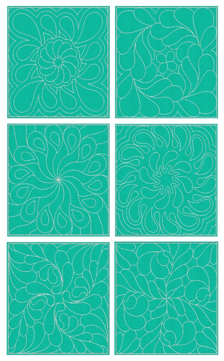 6 more gorgeous featherd style quilt blocks! These blocks include placement and tack down steps for batting and fabric. The quilting step is a triple bean stitch. Stitch these blocks as-is, or use them as a background quilting for a customized project. Add the design of your choice on top of the feather pattern for a unique quilt!