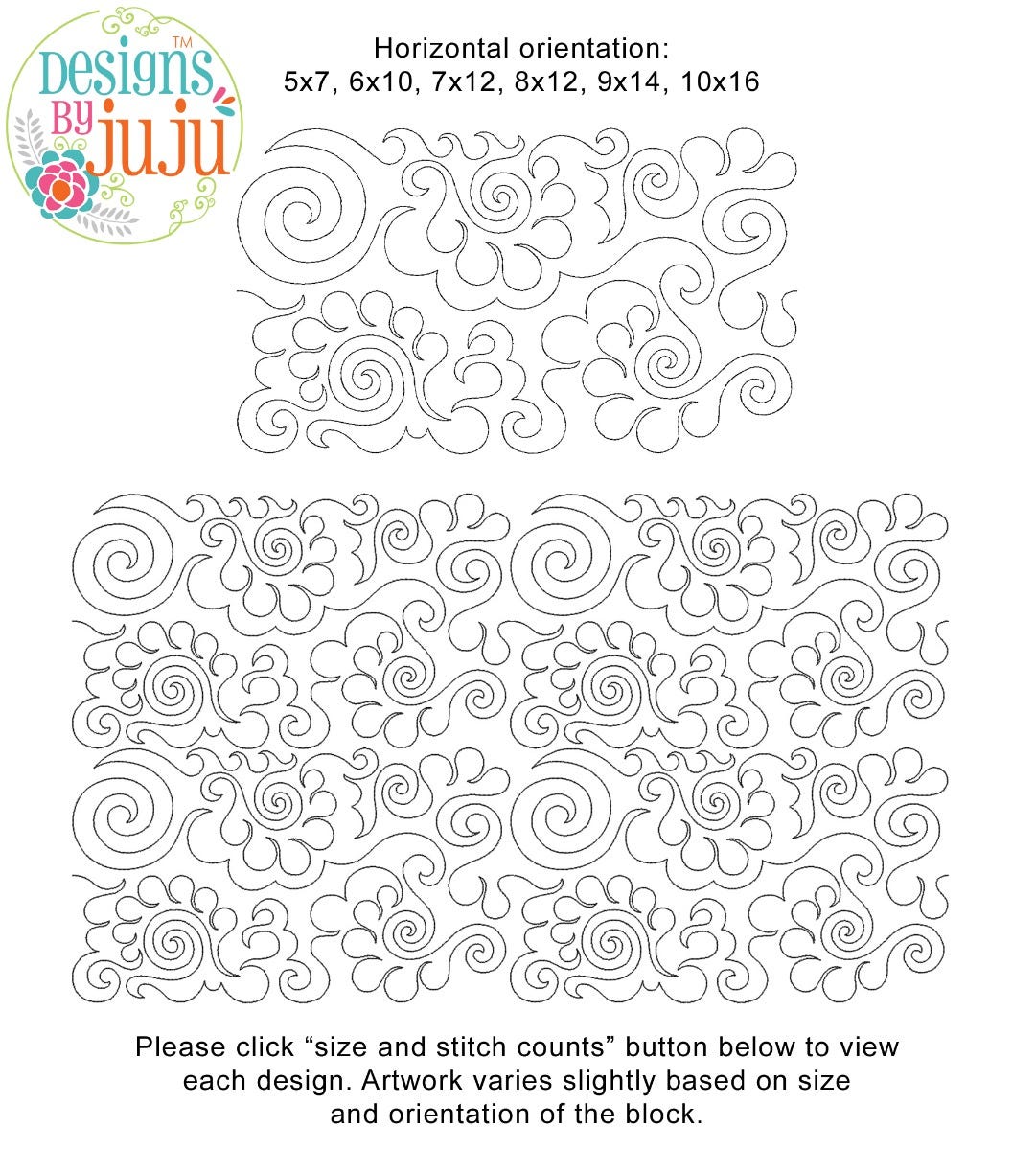 Each one of our End-to-End Quilting™ embroidery designs is an originally created design available in a large variety of block sizes. Every block is one continuous single-run line running edge to edge beginning on the left and exiting on the right. There is NO backtracking or double stitching. Each size block has been engineered and manually digitized by our team for EXACT edge-to-edge quilting precision so that when they are aligned properly in your hoop, you cannot tell where one block ends and the next one begins! ADDITIONALLY, the art has been created for each size so that when the rows are stacked on top of each other, it provides a practically seamless, professional, allover quilting effect that mimics (E2E) pantographs so you can do edge-to-edge quilting on your embroidery machine!