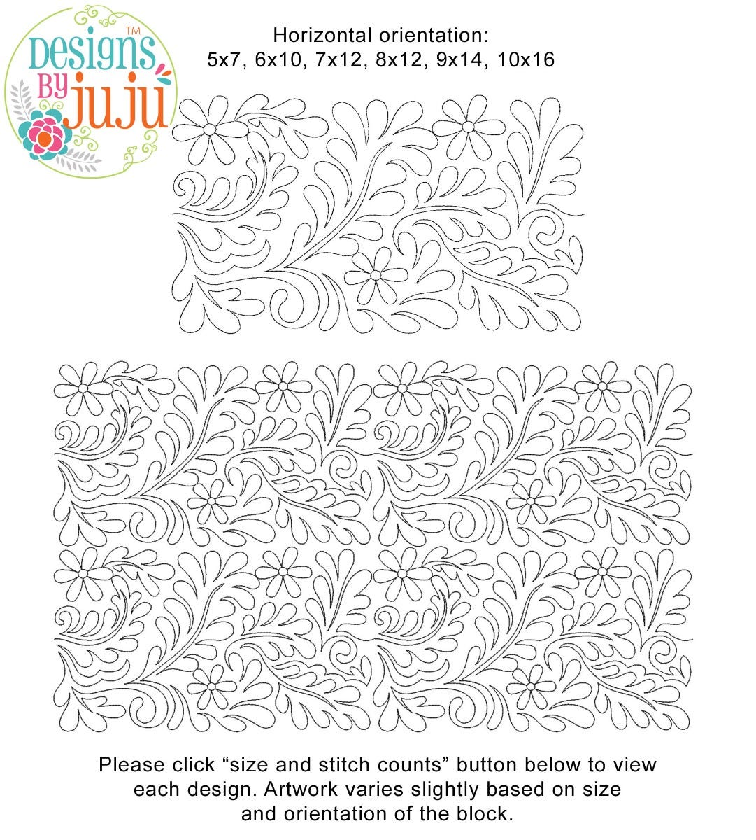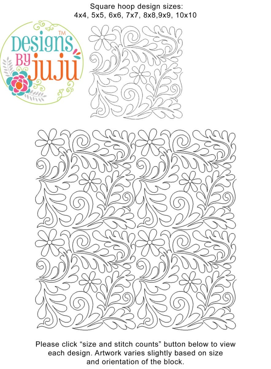 Please note: Both the scale of each pattern and arrangement of the motifs may vary based on the hoop size. Please click the "Size and Stitch Count" button to view the artwork for each size.