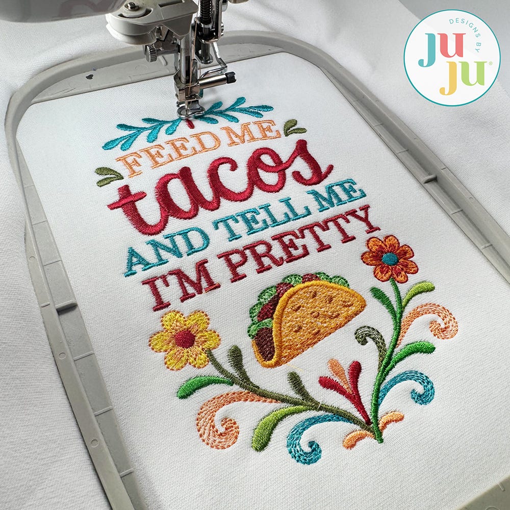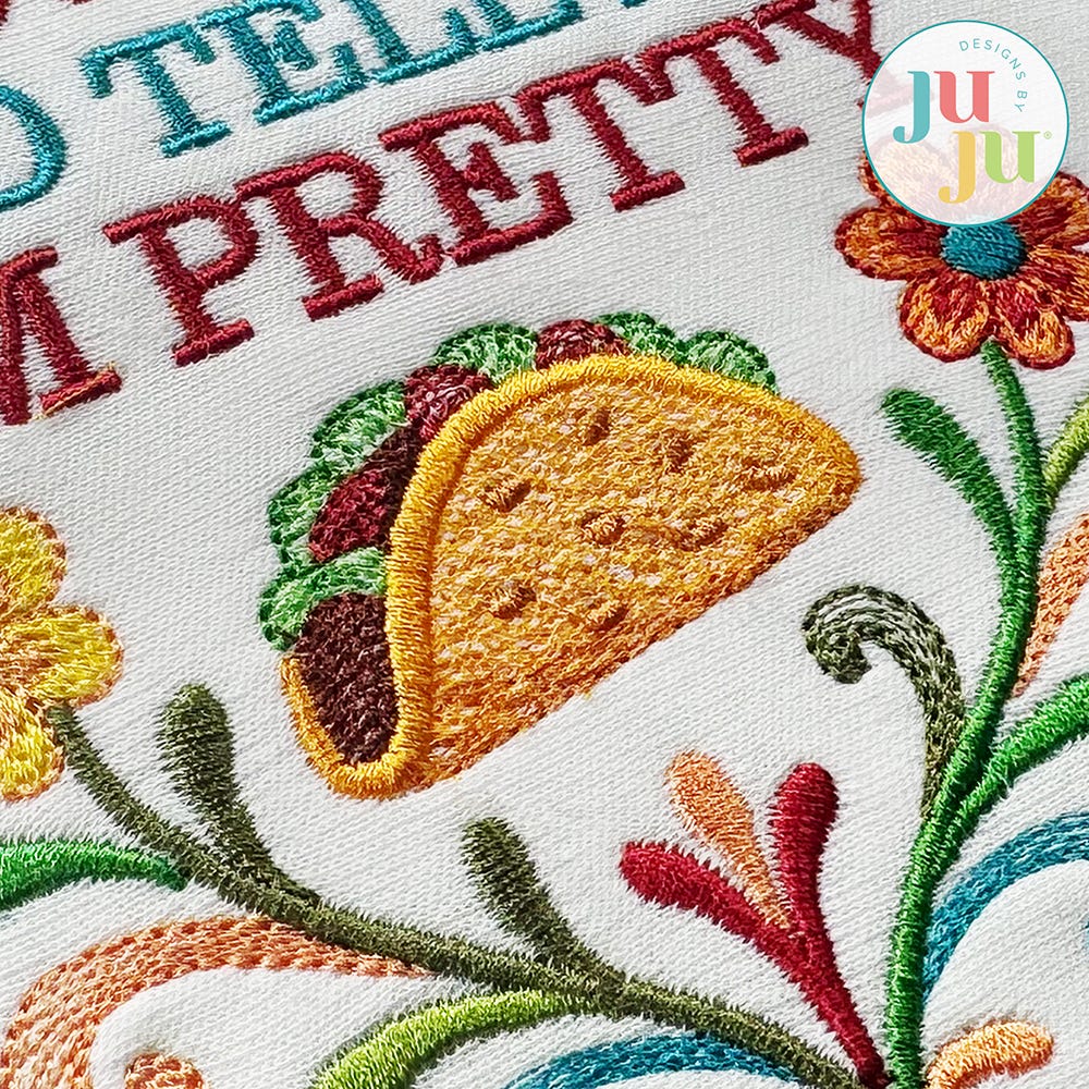 Feed Me Tacos and Tell Me I'm Pretty! This whimsical word art design with adorable taco and festive florals is perfect for Cinco de Mayo and beyond!