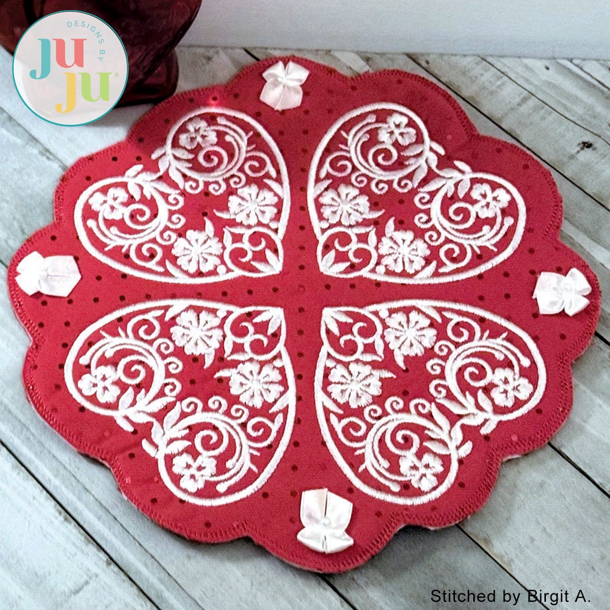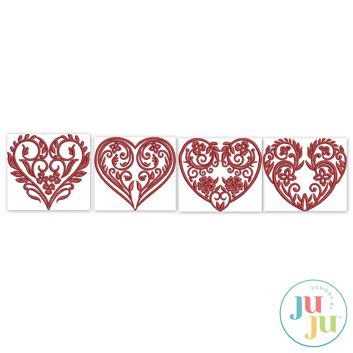 These 4 filigree hearts are fast to stitch and make an attractive home decoration when added to guest towels, pillows, etc. These designs are slightly larger than the center designs on our 3D filigree hearts.