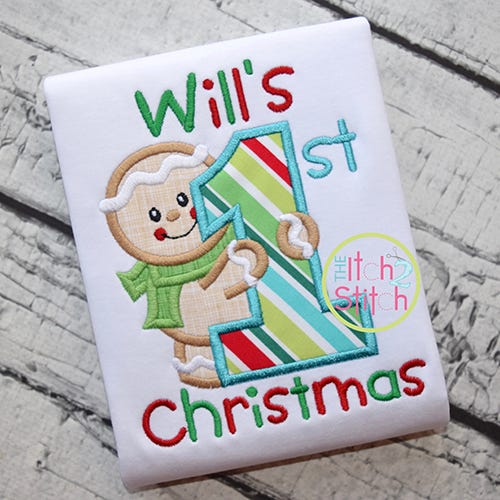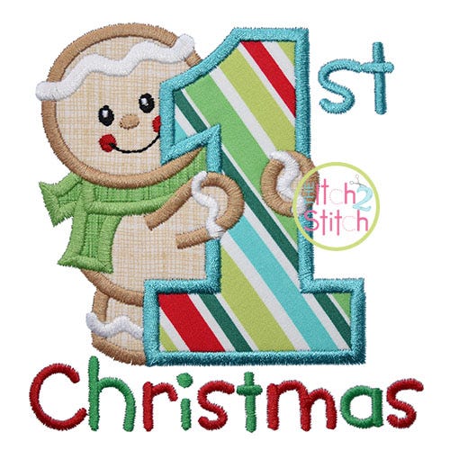 "1st Christmas" text is included in the design file. Name added with our dpTuesday font (NOT included) Shown with ribbon bow added after embroidery was complete (NOT included)