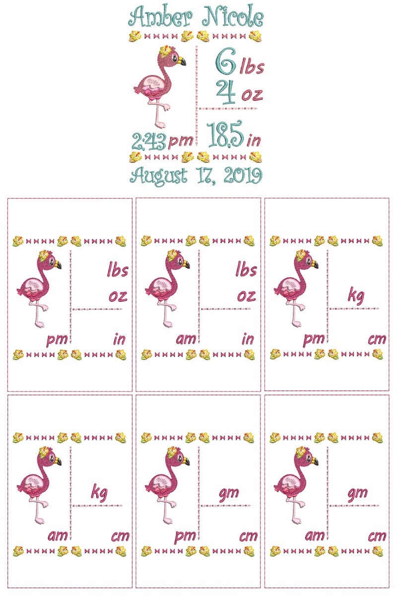 You will receive the embroidery templates shown. Customize with your own names, date, weight and length with fonts from your purchased collection or those that are built in to your embroidery software. Fonts are NOT included with these templates. I have included a "basting" stitch as the first step so that while you are customizing in your software, you can ensure to stay with the parameters of your hoop. Skip the first step upon stitching.