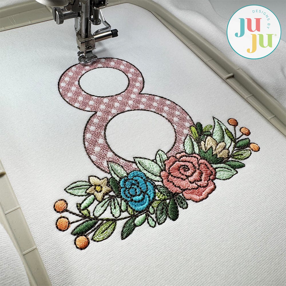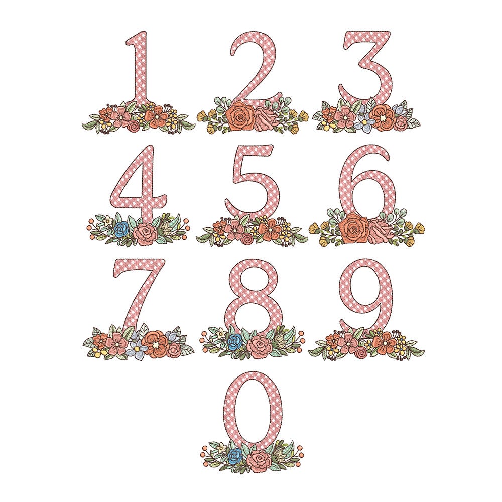 The motif fill stitch numbers are accented with beautiful bouquets of embroidered flowers.