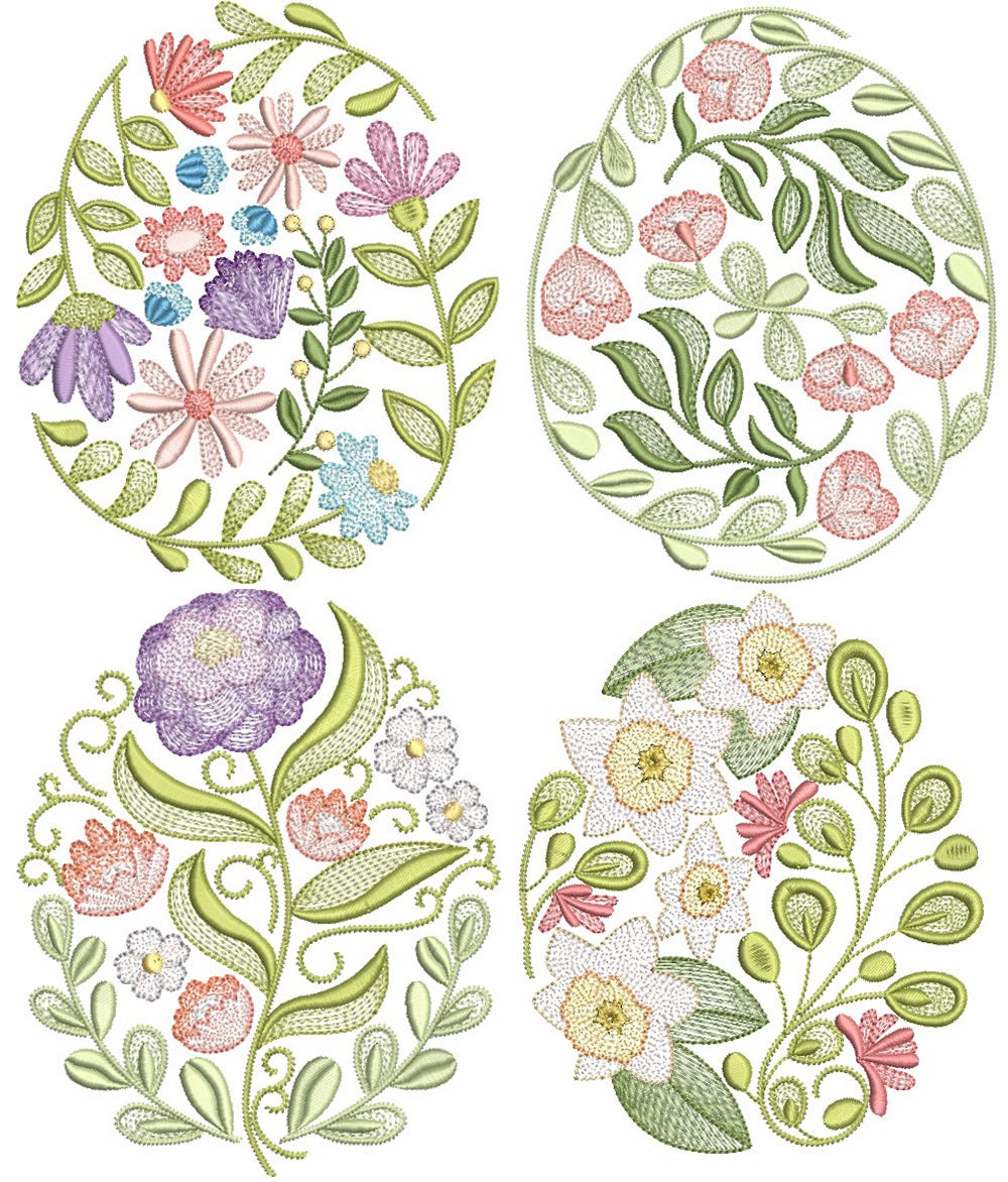 Four elegant floral Easter egg designs featuring a blend of sketch and satin stitch details. 4x4, 5x7, 6x10 & 8x8 hoop sizes included.