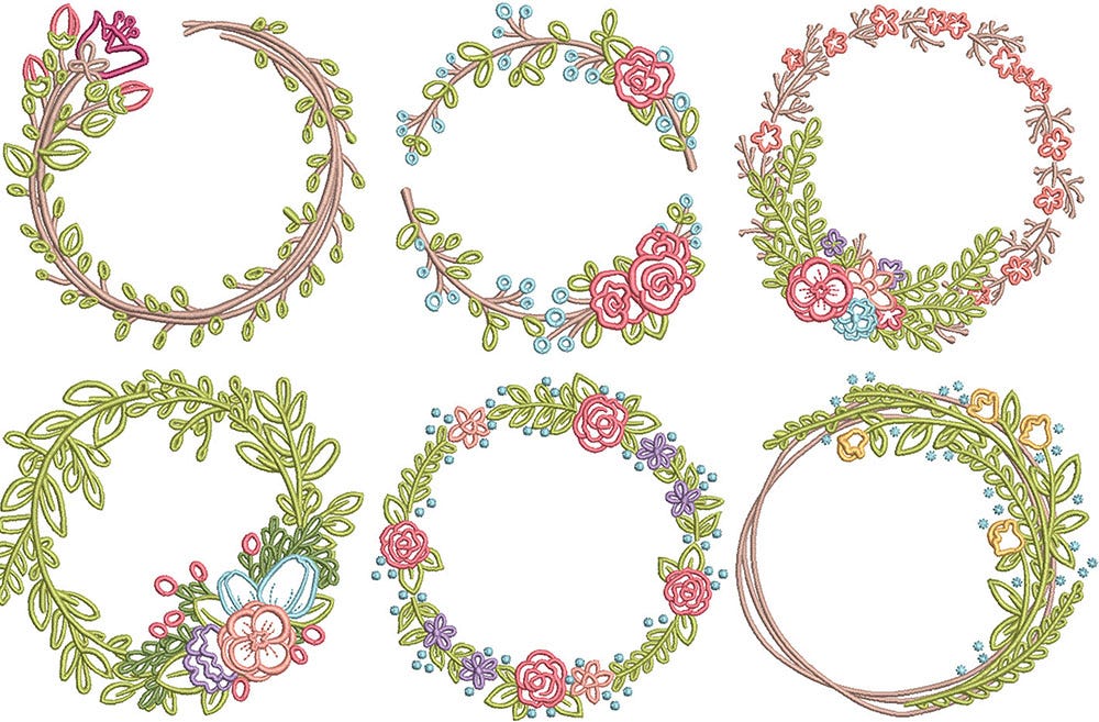 6 beautiful floral wreath designs! These are embroidery-only with satin stitches.