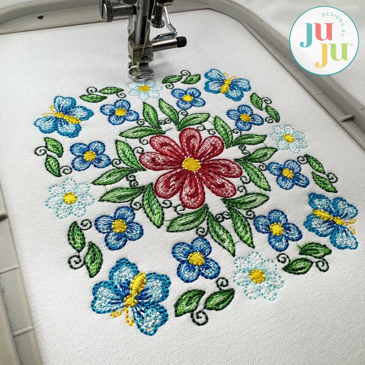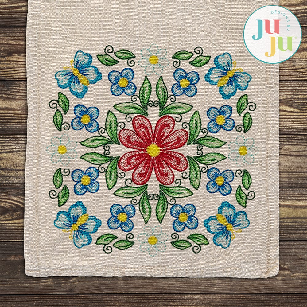 This single, embroidery-only design features intricate floral elements combined with beautiful butterflies, all arranged in a graceful mandala layout—perfect for adding elegance to quilts, home decor, and more.