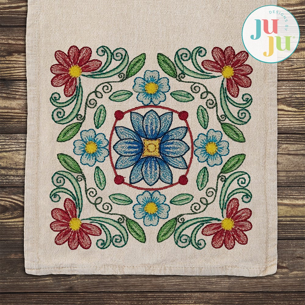 Add floral elegance to your quilts, home decor, and more with our Floral Mandala 4 design. This single, embroidery-only design showcases a lovely center flower surrounded by swirly vines, leaves, and other flowers.
