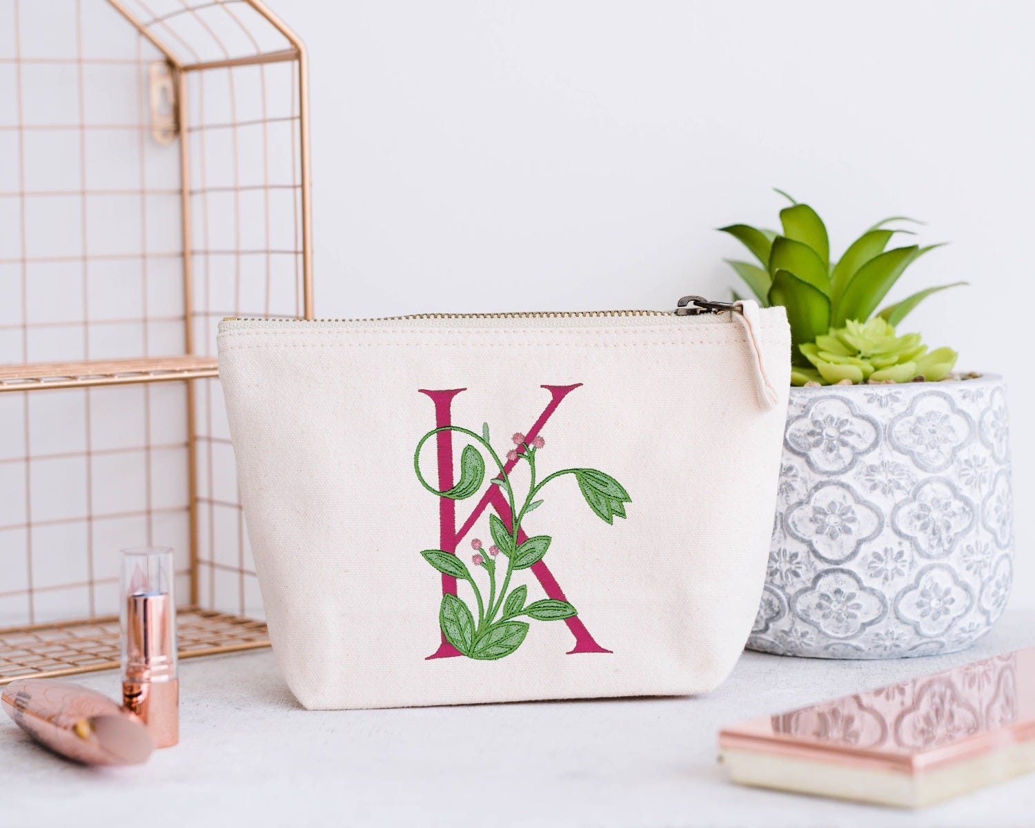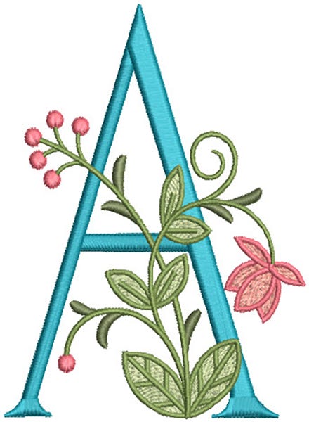 Our Floral Swirls Monogram features satin stitch lettering with a floral spray.