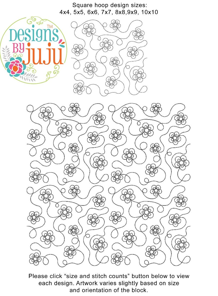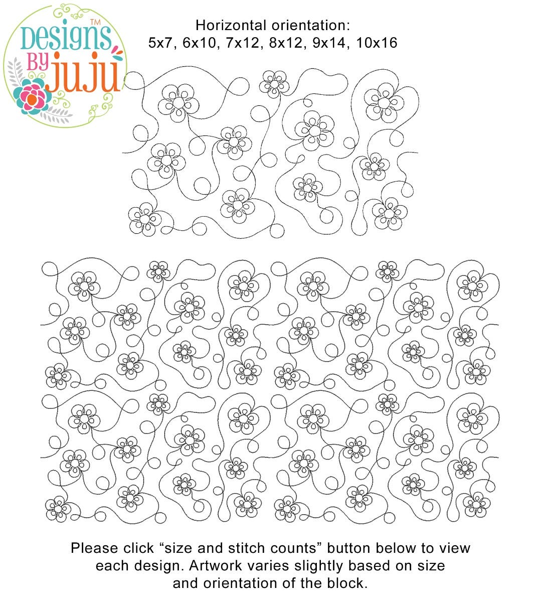 Each one of our End-to-End Quilting™ embroidery designs is an originally created design available in a large variety of block sizes. Every block is one continuous single-run line running edge to edge beginning on the left and exiting on the right. There is NO backtracking or double stitching. Each size block has been engineered and manually digitized by our team for EXACT edge-to-edge quilting precision so that when they are aligned properly in your hoop, you cannot tell where one block ends and the next one begins! ADDITIONALLY, the art has been created for each size so that when the rows are stacked on top of each other, it provides a practically seamless, professional, allover quilting effect that mimics (E2E) pantographs so you can do edge-to-edge quilting on your embroidery machine!
