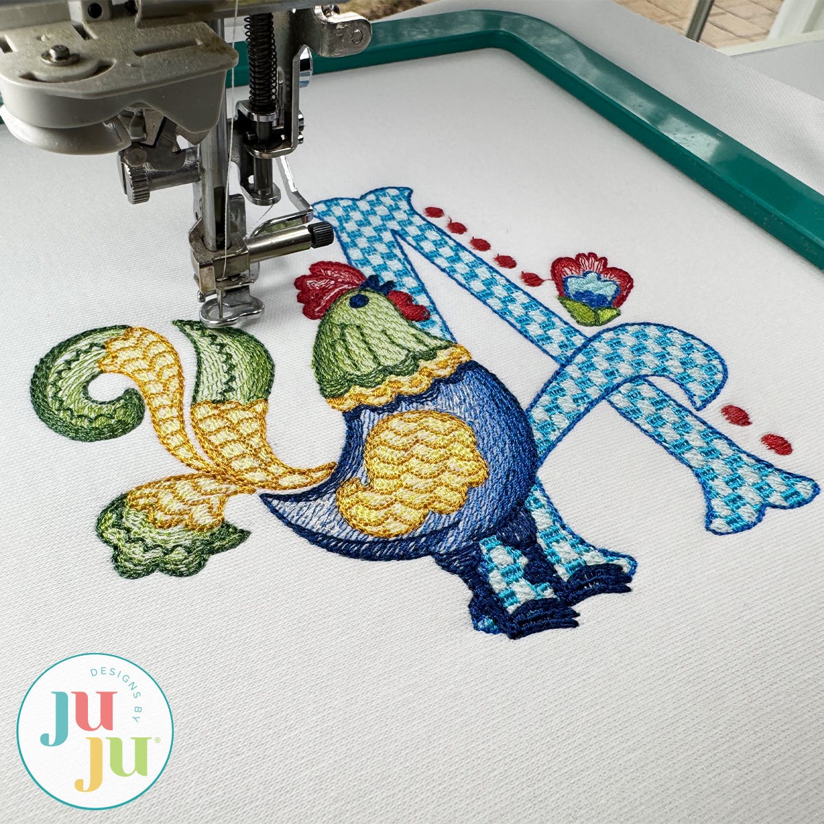The motif fill stitch letters are topped with embroidered chickens. The chickens feature multiple color layers of lighter density fill to create a blended, variegated, textured look.