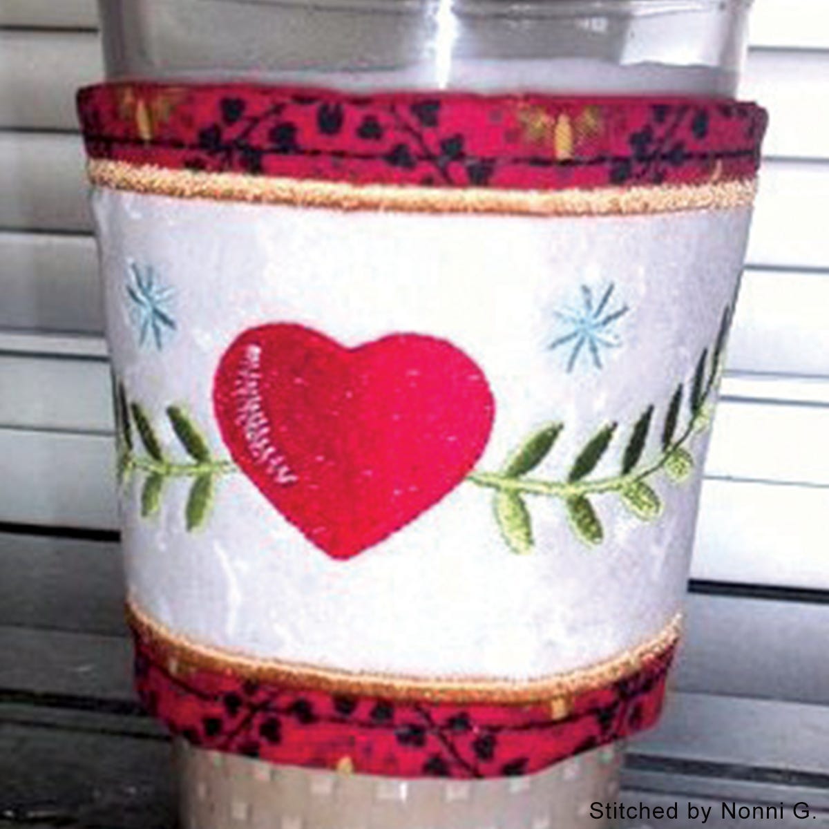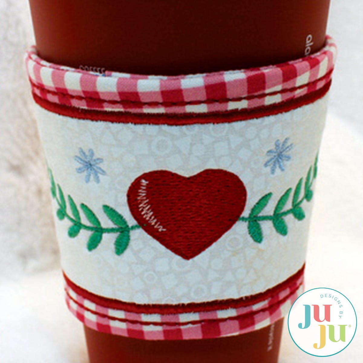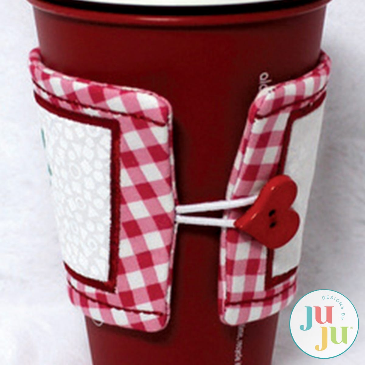 The cup wrap was designed to fit around a Starbuck sized coffee cup but will fit other cups as well because of the elastic in the back that holds the wrap in position. You are receiving a cup wrap with the center motif as well as without the motif so you can add a name or just have the wrap showcase your choice of fabrics.