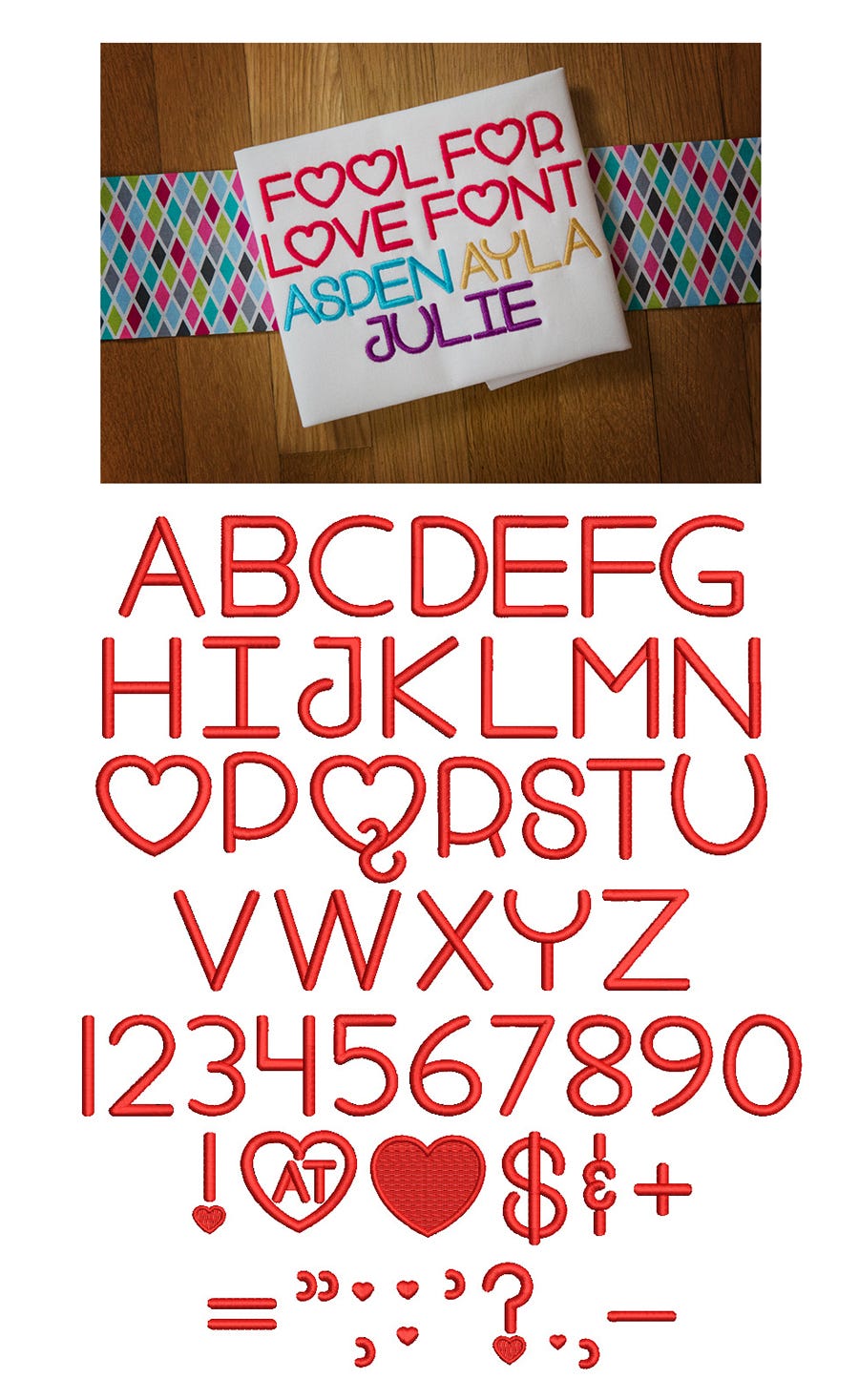 Here is a super cute and simple font great for Valentine's Day..or any day! This is a unicase font with some really cute symbols and renditions of the letters O and Q in heart form. Love is in the air! Ā All of our font alphabets are 100% manually digitized to bring you maximum stitch quality.