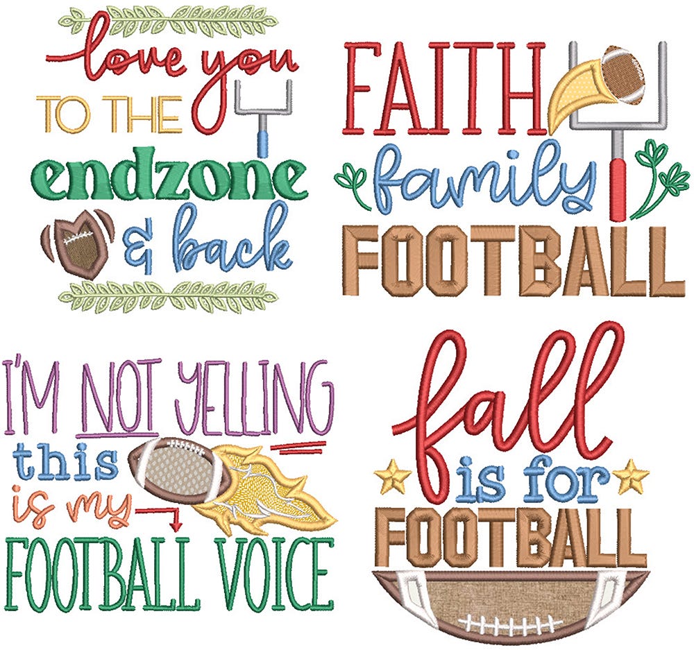 4 more super cute American Football word art designs! These designs feature satin stitch lettering with applique components.