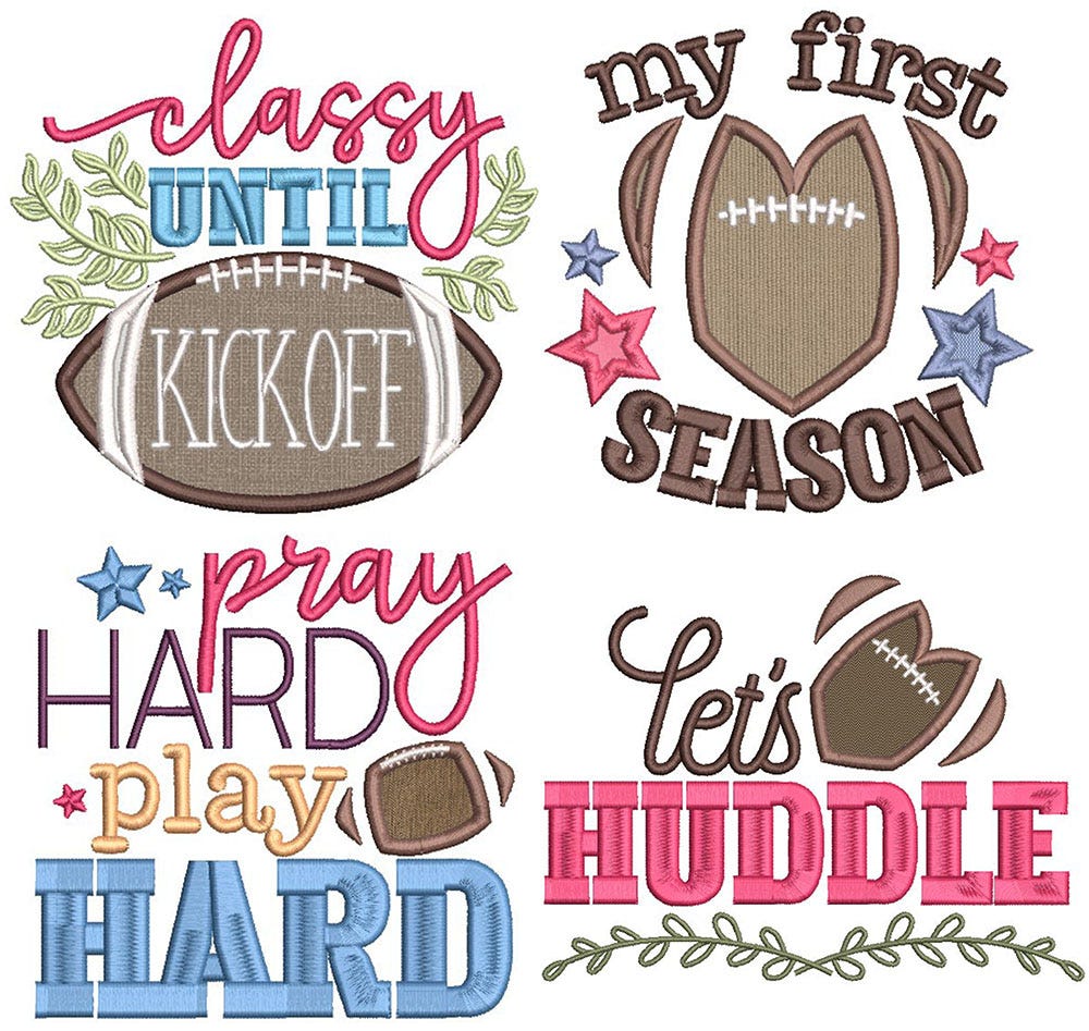 4 more super cute American Football word art designs! These designs feature satin stitch lettering with applique components.